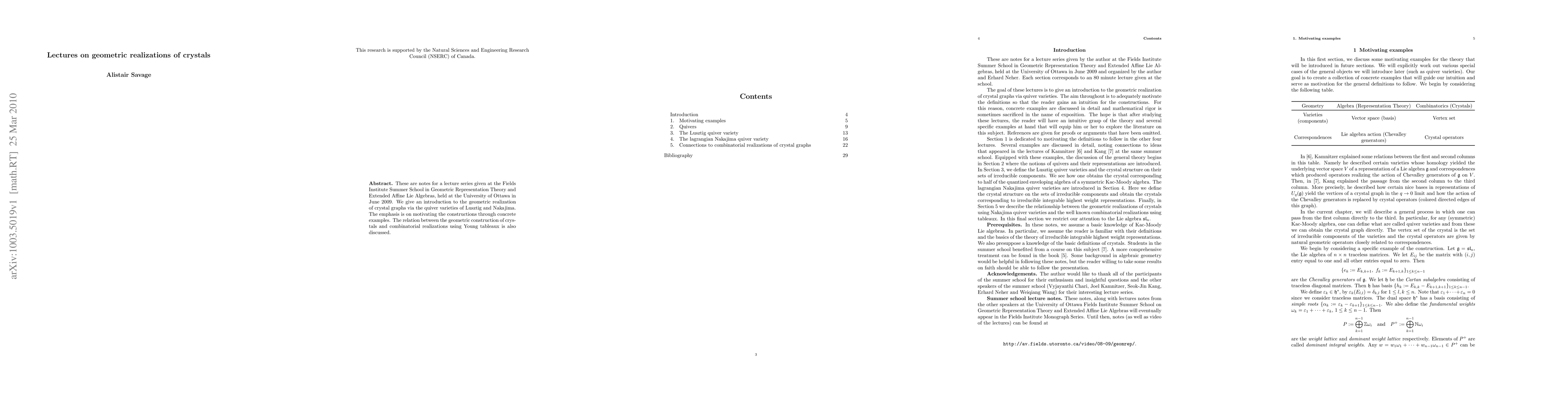 This lecture series introduces a geometric realization of crystal graphs using quiver varieties, providing concrete examples to motivate the construction. It also explores the connection between this approach and combinatorial realizations using Young tableaux.