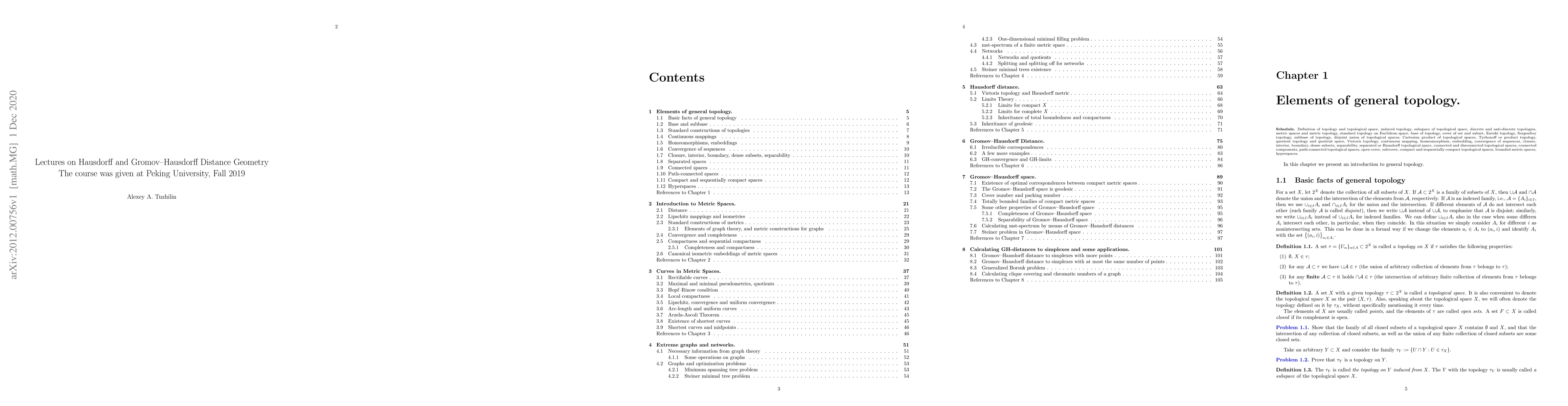 The course was given at Peking University, Fall 2019. We discuss the following subjects: (1) Introduction to general topology, hyperspaces, metric and pseudometric spaces, graph theory. (2) Graphs in metric spaces, minimum spanning tree, Steiner minimal tree, Gromov minimal filling. (3) Hausdorff distance, Vietoris topology, Limits theory, inheritance of completeness, total boundedness, compactness by hyperspaces. (4) Gromov-Hausdorff distance, triangle inequality, positive definiteness for isometry classes of compact spaces, counterexample for boundedly compact spaces. (5) Gromov-Hausdorff distance for separable spaces in terms of their isometric images in \ell_\infty, correspondences, Gromov-Hausdorff distance in terms of correspondences. (6) Epsilon-isometries and Gromov-Hausdorff distance. (7) Irreducible correspondences and Gromov-Hausdorff distance. (8) Gromov-Hausdorff convergence, inheritance of metric and topological properties while Gromov-Hausdorff convergence. (9) Gromov-Hausdorff space (GH-space), optimal correspondences, existence of closed optimal correspondences for compact metric spaces, GH-space is geodesic. (10) Cover number, packing number, total boundedness, completeness, and separability of GH-space. (11) mst-spectrum in terms of GH-distances to simplexes, Steiner problem in GH-space. (12) GH-distance to simplexes with more points, GH-distance to simplexes with at most the same number of points. (13) Generalized Borsuk problem, solution of Generalized Borsuk problem in terms of GH-distances, clique covering number and chromatic number of simple graphs, their dualities, calculating these numbers in terms of GH-distances.