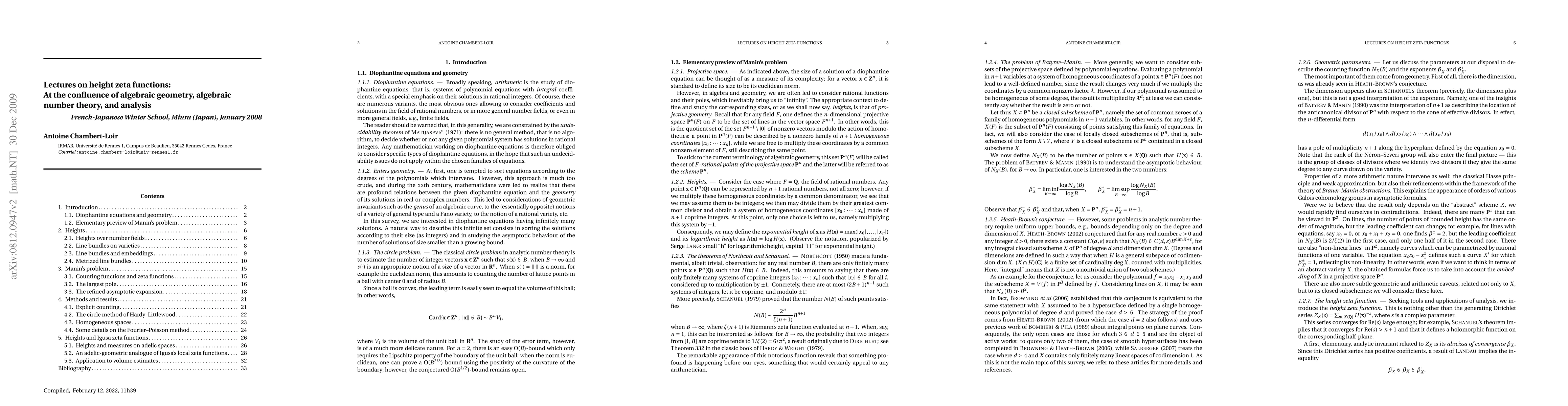This is a survey on the theory of height zeta functions, written on the occasion of a French-Japanese winter school, held in Miura (Kanagawa, Japan) in Jan. 2008. It does not presuppose much knowledge in algebraic geometry. The last chapter of the survey explains recent results obtained in collaboration with Yuri Tschinkel concerning asymptotics of volumes of height balls in analytic geometry over local fields, or in adelic spaces.