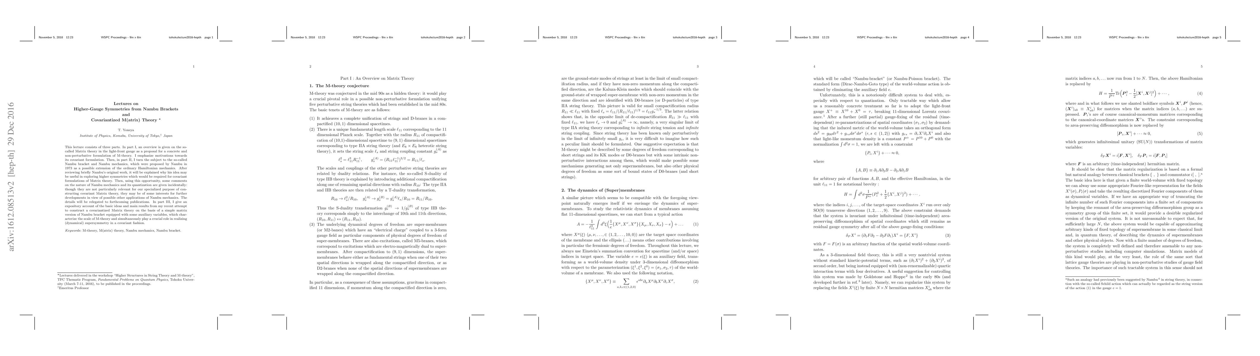 This paper reviews Matrix theory and explores its covariant formulation through Nambu brackets and mechanics, emphasizing higher-gauge symmetries and the construction of a covariantized Matrix theory. The focus is on extending Hamiltonian mechanics to Nambu mechanics for exploring higher symmetries and realizing dynamical supersymmetry.