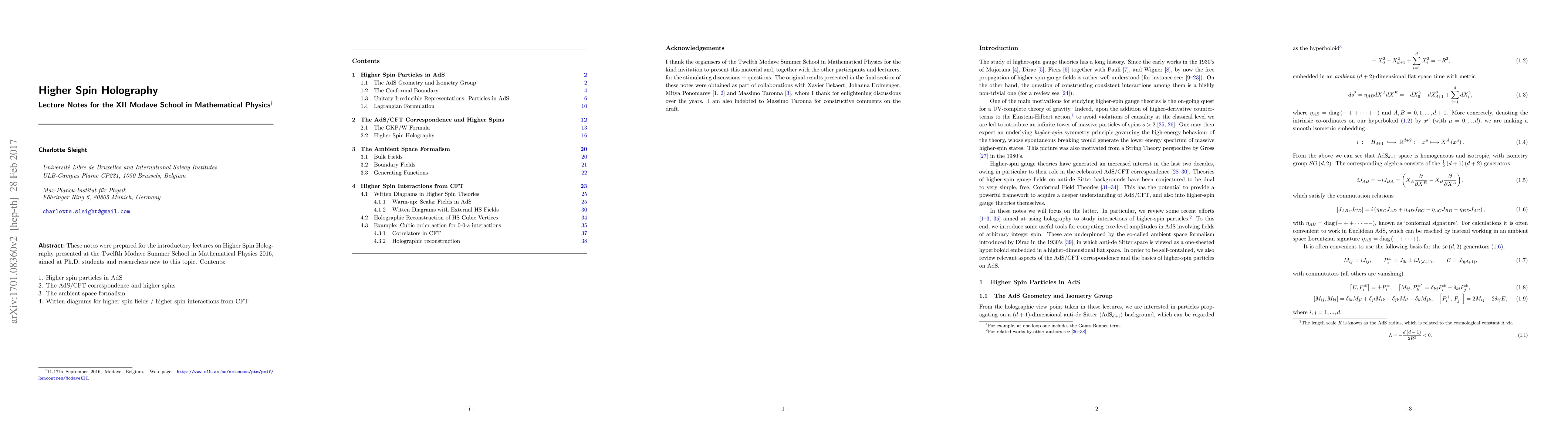 Summary: These lecture notes introduce Higher Spin Holography, focusing on higher spin particles in AdS, the AdS/CFT correspondence, and the ambient space formalism, with an emphasis on Witten diagrams for higher spin fields and interactions derived from conformal field theory. Aimed at Ph.D. students and researchers new to the field.