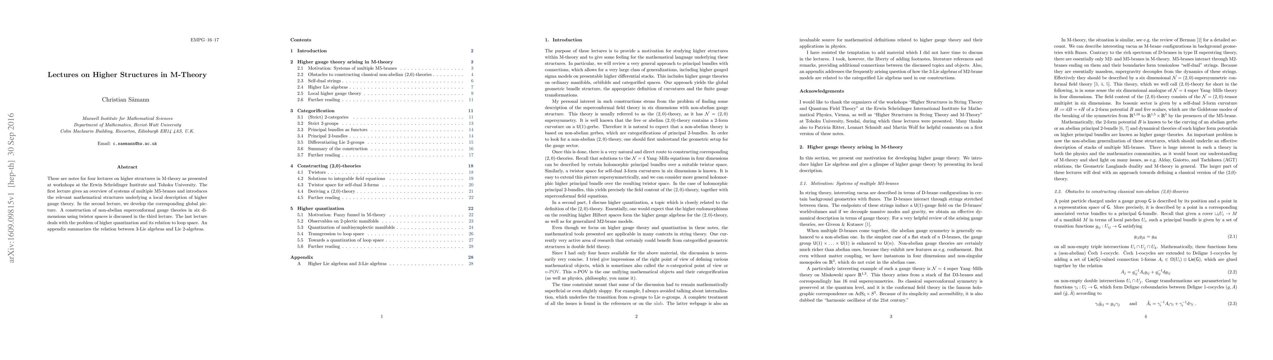 These lecture notes explore higher structures in M-theory, focusing on multiple M5-branes and the mathematical framework of higher gauge theory. They also cover non-abelian superconformal gauge theories in six dimensions via twistor spaces and discuss higher quantization in relation to loop space.