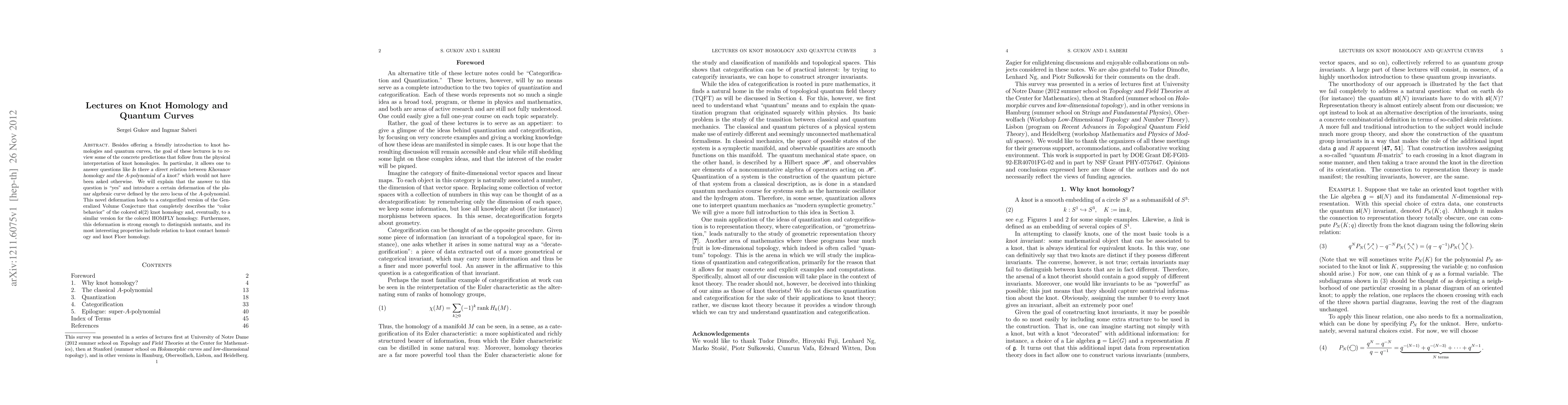 Besides offering a friendly introduction to knot homologies and quantum curves, the goal of these lectures is to review some of the concrete predictions that follow from the physical interpretation of knot homologies. In particular, this interpretation allows one to pose questions that would not have been asked otherwise, such as, "Is there a direct relation between Khovanov homology and the A-polynomial of a knot?" We will explain that the answer to this question is "yes," and introduce a certain deformation of the planar algebraic curve defined by the zero locus of the A-polynomial. This novel deformation leads to a categorified version of the Generalized Volume Conjecture that completely describes the "color behavior" of the colored sl(2) knot homology, and eventually to a similar version for the colored HOMFLY homology. Furthermore, this deformation is strong enough to distinguish mutants, and its most interesting properties include relations to knot contact homology and knot Floer homology.