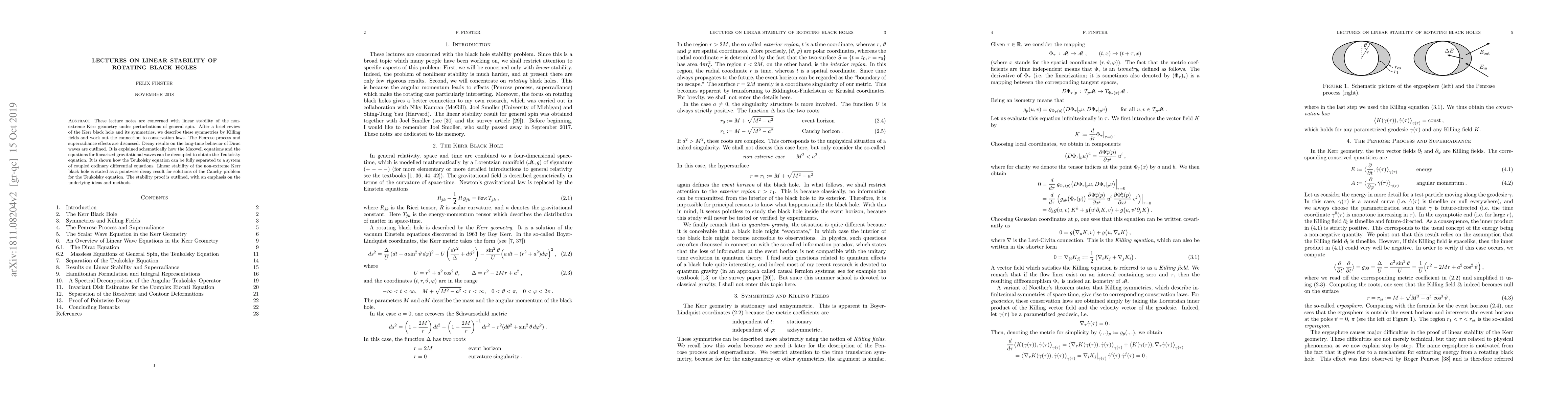 These lecture notes are concerned with linear stability of the non-extreme Kerr geometry under perturbations of general spin. After a brief review of the Kerr black hole and its symmetries, we describe these symmetries by Killing fields and work out the connection to conservation laws. The Penrose process and superradiance effects are discussed. Decay results on the long-time behavior of Dirac waves are outlined. It is explained schematically how the Maxwell equations and the equations for linearized gravitational waves can be decoupled to obtain the Teukolsky equation. It is shown how the Teukolsky equation can be fully separated to a system of coupled ordinary differential equations. Linear stability of the non-extreme Kerr black hole is stated as a pointwise decay result for solutions of the Cauchy problem for the Teukolsky equation. The stability proof is outlined, with an emphasis on the underlying ideas and methods.