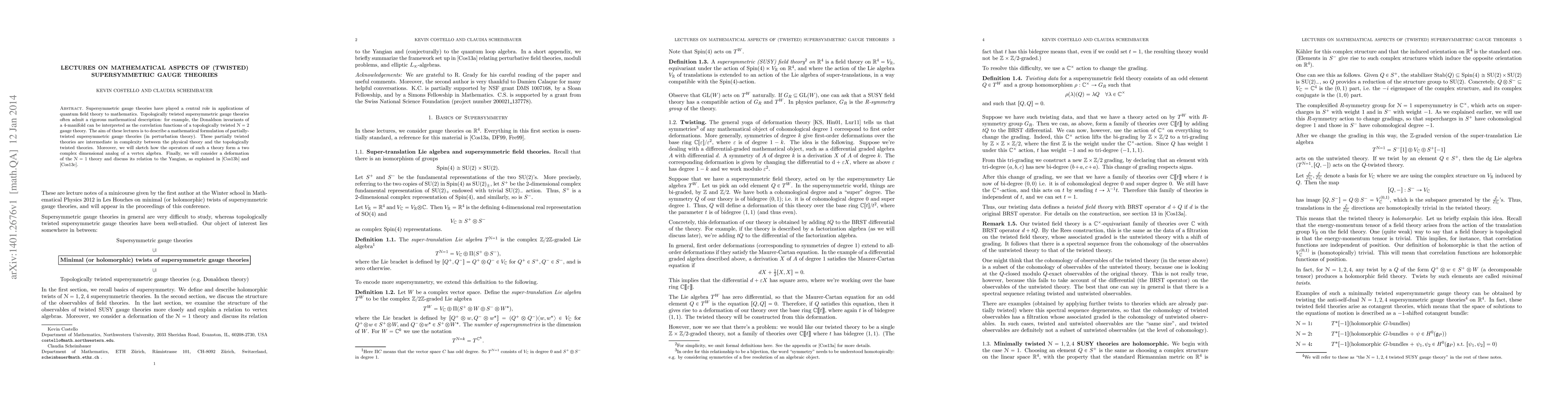 Supersymmetric gauge theories have played a central role in applications of quantum field theory to mathematics. Topologically twisted supersymmetric gauge theories often admit a rigorous mathematical description: for example, the Donaldson invariants of a 4-manifold can be interpreted as the correlation functions of a topologically twisted N=2 gauge theory. The aim of these lectures is to describe a mathematical formulation of partially-twisted supersymmetric gauge theories (in perturbation theory). These partially twisted theories are intermediate in complexity between the physical theory and the topologically twisted theories. Moreover, we will sketch how the operators of such a theory form a two complex dimensional analog of a vertex algebra. Finally, we will consider a deformation of the N=1 theory and discuss its relation to the Yangian, as explained in arXiv:1308.0370 and arXiv:1303.2632.