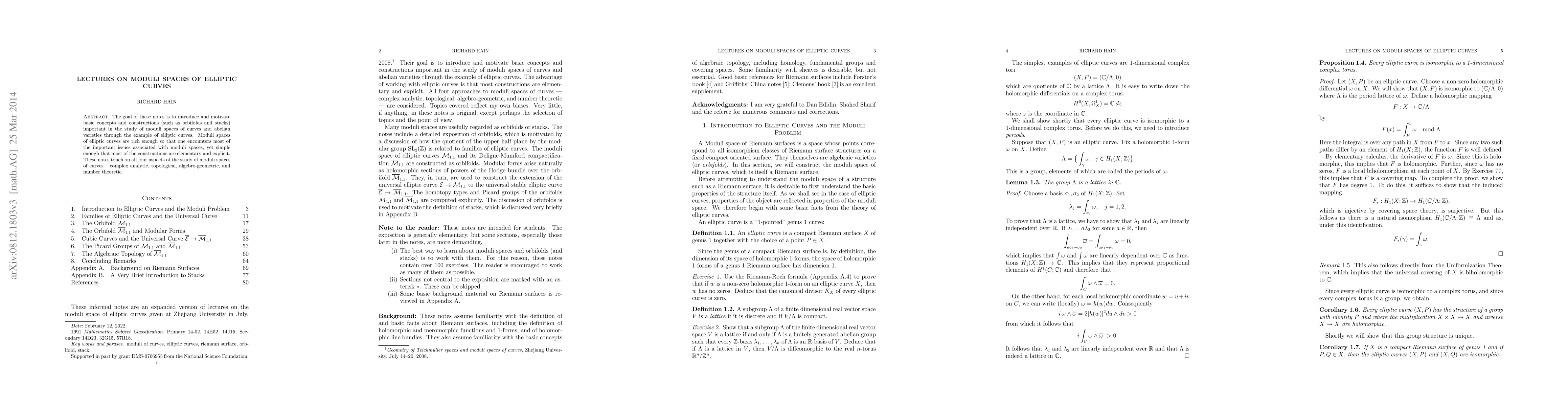 These informal notes are an expanded version of lectures on the moduli space of elliptic curves given at Zhejiang University in July, 2008. Their goal is to introduce and motivate basic concepts and constructions (such as orbifolds and stacks) important in the study of moduli spaces of curves and abelian varieties through the example of elliptic curves. The reason for working with elliptic curves is that most constructions are elementary and explicit in this case. All four approaches to moduli spaces of curves -- complex analytic, topological, algebro-geometric, and number theoretic -- are considered. Topics covered reflect my own biases. Very little, if anything, in these notes is original, except perhaps the selection of topics and the point of view.
