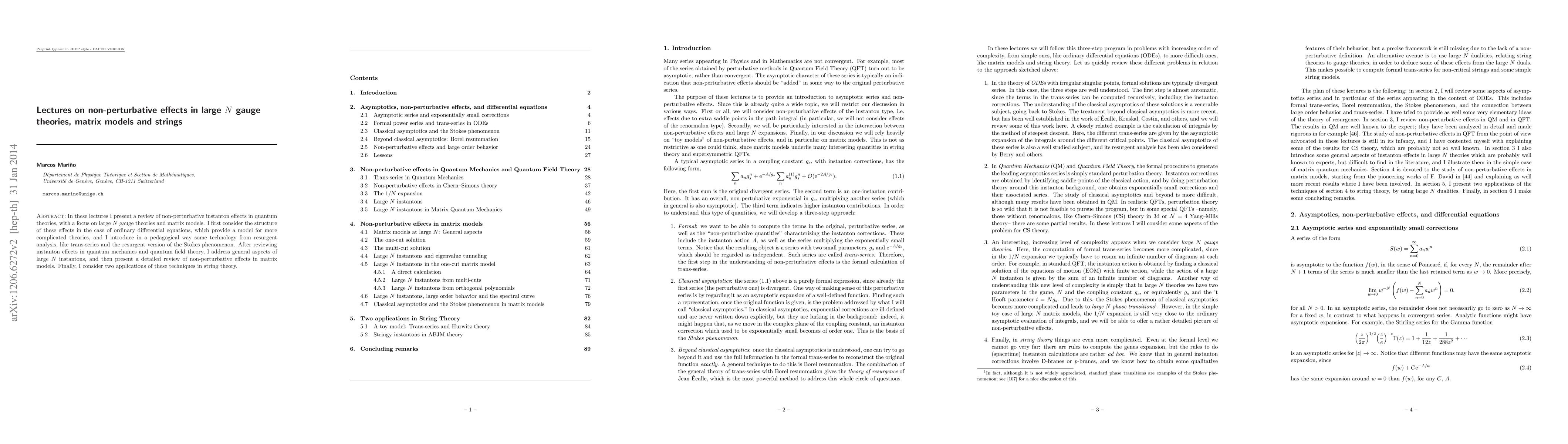 This paper reviews non-perturbative instanton effects in large N gauge theories and matrix models, introducing concepts from resurgent analysis and applying these techniques to quantum mechanics and field theory, with a detailed examination of matrix models and applications in string theory.