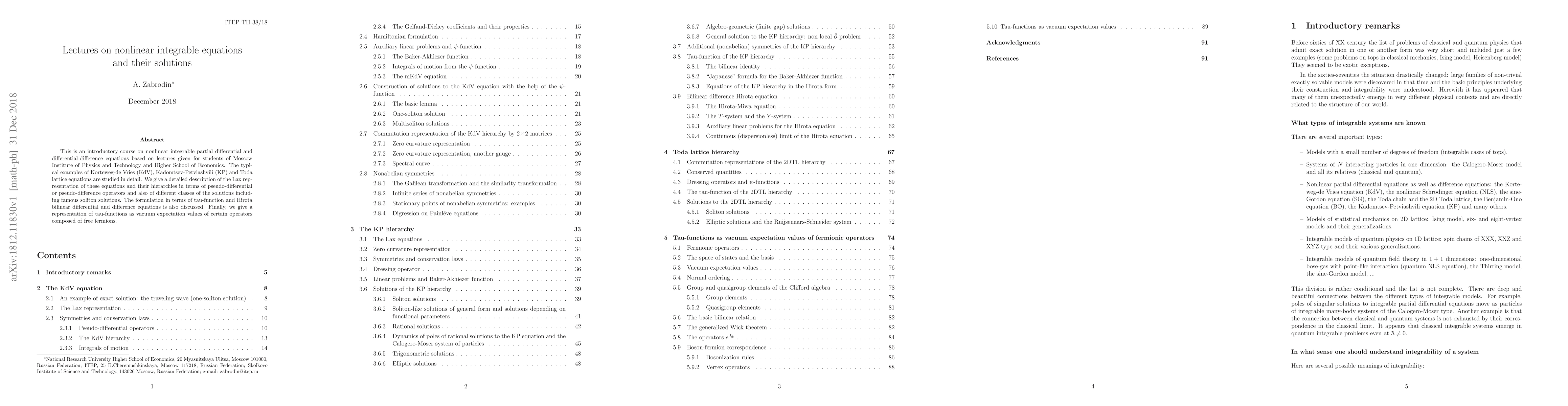 This paper provides an introductory course on nonlinear integrable equations, focusing on the Korteweg-de Vries, Kadomtsev-Petviashvili, and Toda lattice equations. It explores their Lax representation, hierarchies, and various soliton solutions, concluding with a discussion on tau-functions and their relation to free fermions.