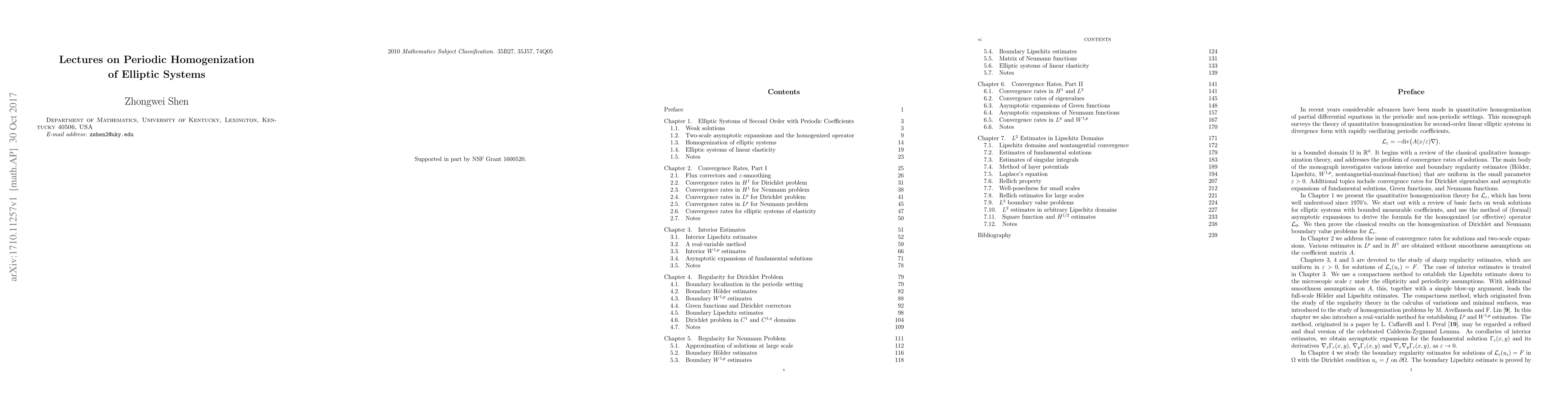 This monograph surveys the quantitative homogenization theory for second-order linear elliptic systems with periodic coefficients, focusing on convergence rates and regularity estimates. It builds on classical homogenization theory and includes discussions on Dirichlet eigenvalues, asymptotic expansions, and joint research contributions.