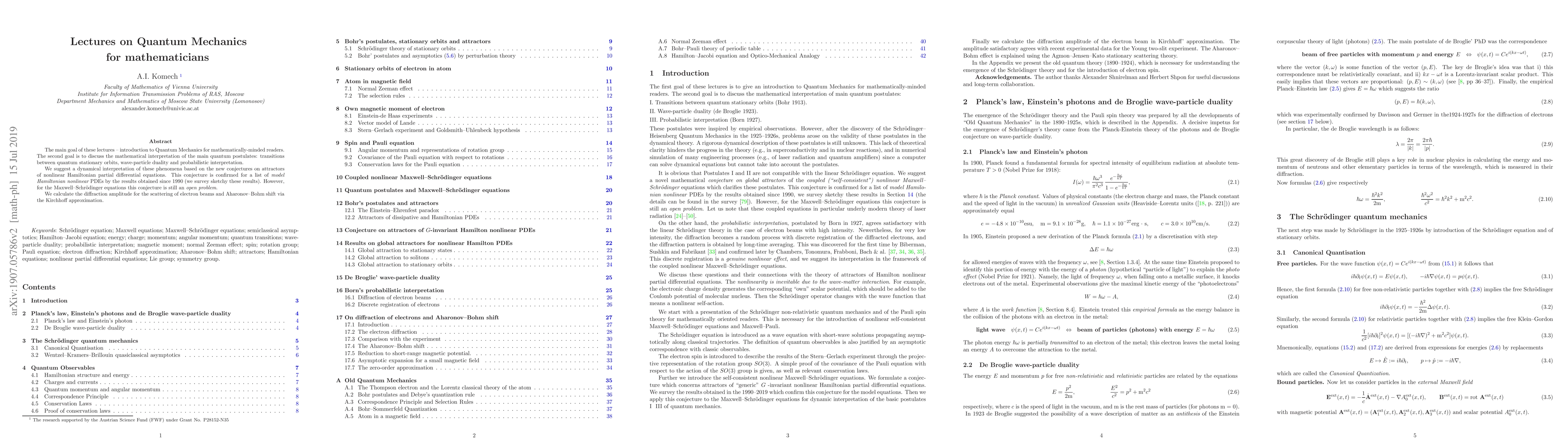 The main goal of these lectures -- introduction to Quantum Mechanics for mathematically-minded readers. The second goal is to discuss the mathematical interpretation of the main quantum postulates: transitions between quantum stationary orbits, wave-particle duality and probabilistic interpretation. We suggest a dynamical interpretation of these phenomena based on the new conjectures on attractors of nonlinear Hamiltonian partial differential equations. This conjecture is confirmed for a list of {\it model Hamiltonian nonlinear} PDEs by the results obtained since 1990 (we survey sketchy these results). However, for the Maxwell--Schr\"odinger equations this conjecture is still an {\it open problem}. We calculate the diffraction amplitude for the scattering of electron beams and Aharonov--Bohm shift via the Kirchhoff approximation.
