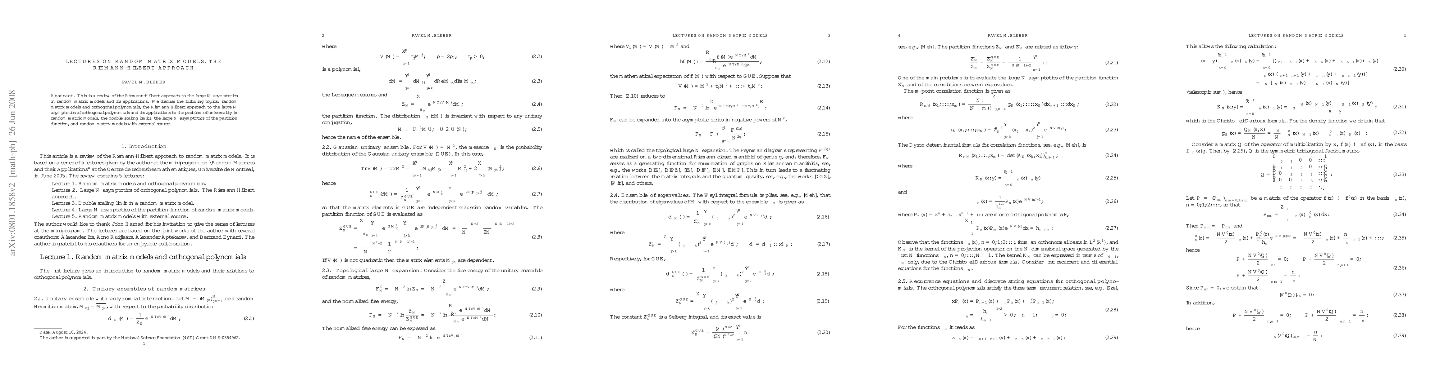 This paper reviews the Riemann-Hilbert approach to analyzing large $N$ asymptotics in random matrix models, focusing on orthogonal polynomials and applications to universality, double scaling limits, partition functions, and models with external sources.