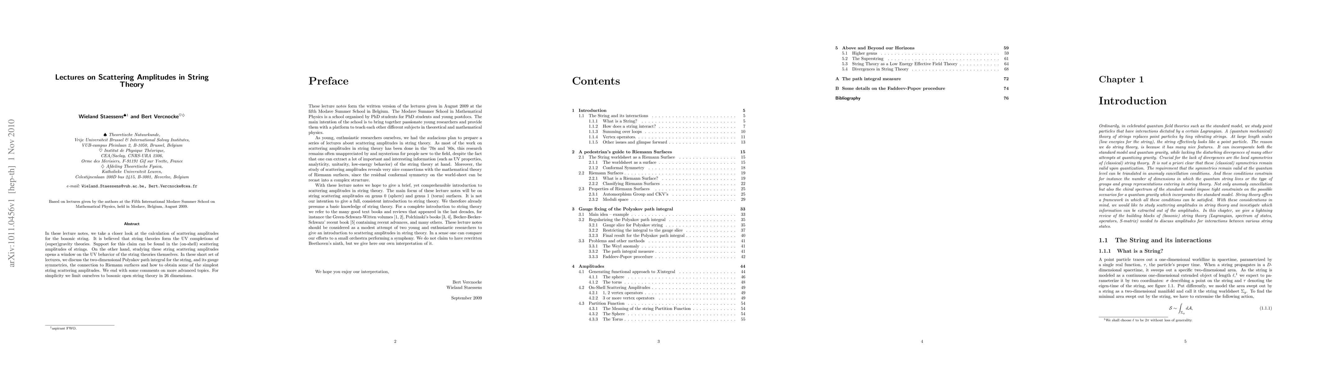 Summary: These lecture notes explore the calculation of scattering amplitudes in bosonic string theory, focusing on the Polyakov path integral, gauge symmetries, and their connection to Riemann surfaces. They highlight the importance of these amplitudes in understanding the ultraviolet behavior and potential UV completions of supergravity theories.