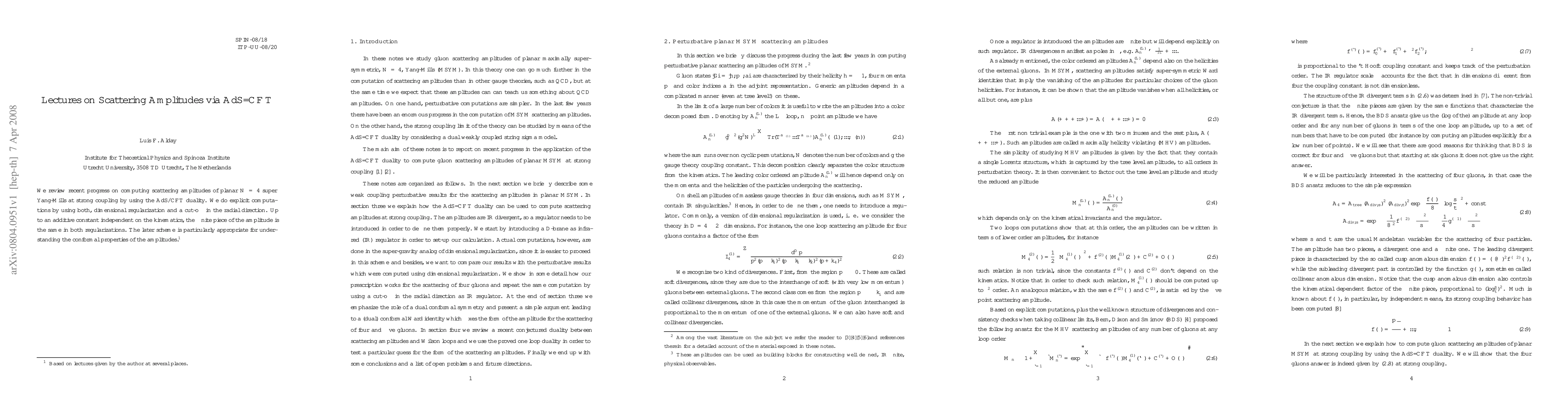We review recent progress on computing scattering amplitudes of planar N=4 super Yang-Mills at strong coupling by using the AdS/CFT duality. We do explicit computations by using both, dimensional regularization and a cut-off in the radial direction. Up to an additive constant independent on the kinematics, the finite piece of the amplitude is the same in both regularizations. The later scheme is particularly appropriate for understanding the conformal properties of the amplitudes.