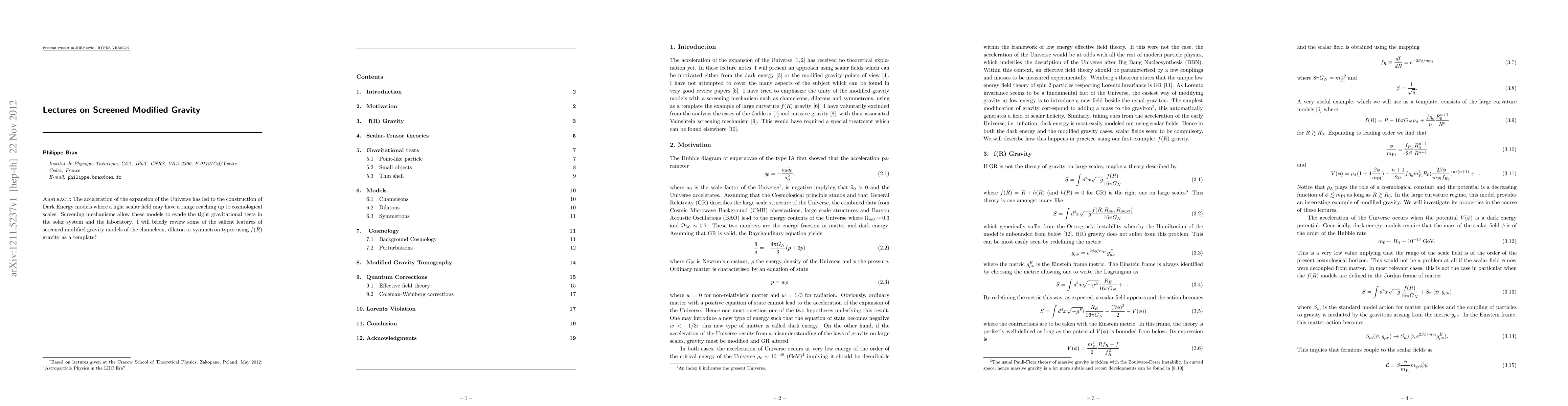 This paper reviews screened modified gravity models, such as chameleon, dilaton, or symmetron, which utilize $f(R)$ gravity to explain the accelerated expansion of the Universe. These models incorporate screening mechanisms to avoid stringent gravitational tests in the solar system and laboratory settings.