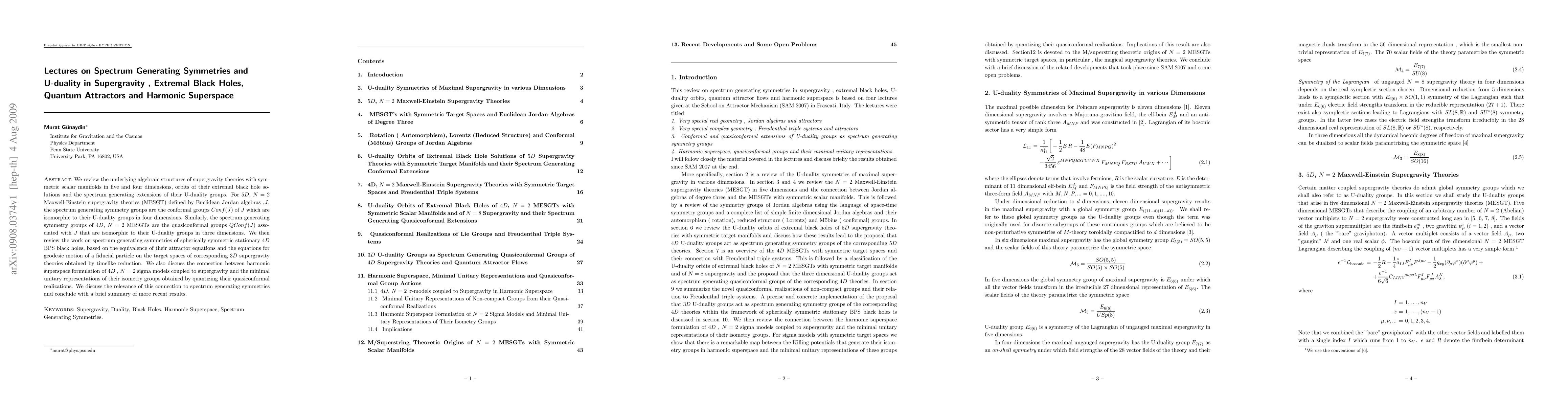 This paper reviews supergravity theories' algebraic structures and their U-duality groups, particularly focusing on 5D and 4D N=2 Maxwell-Einstein supergravity. It explores the spectrum generating symmetries of extremal black holes and connections to quantum attractors and harmonic superspace formulations.