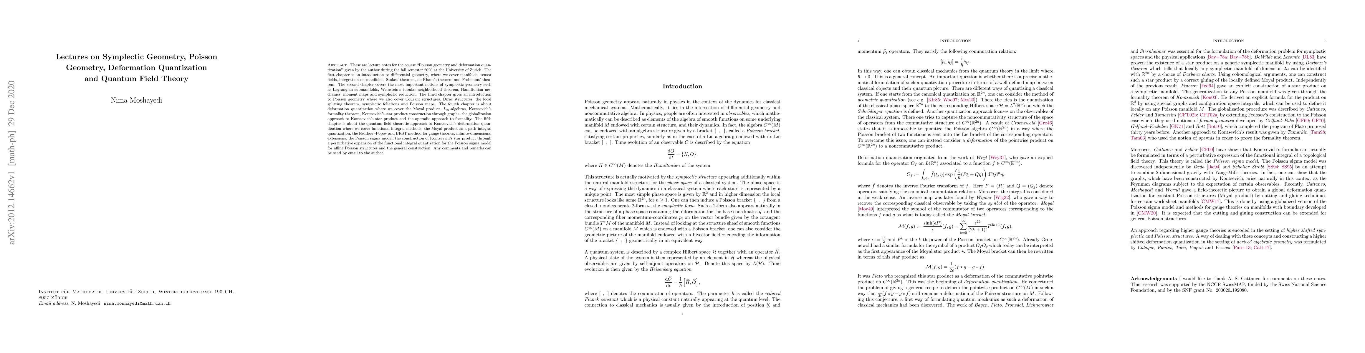 This paper provides lecture notes on Poisson geometry and deformation quantization, covering differential geometry, symplectic geometry, Poisson geometry, deformation quantization techniques, and the quantum field theory approach to deformation quantization. It introduces fundamental concepts and advanced methods for quantization, including the Moyal product and BRST formalism.