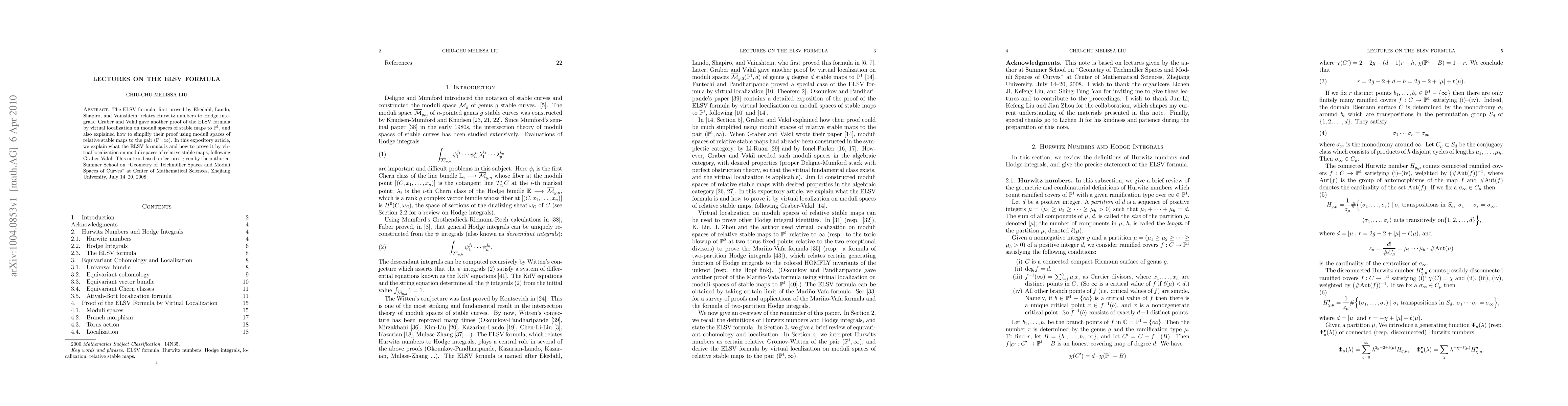 This paper explains the ELSV formula, which connects Hurwitz numbers to Hodge integrals, and presents a proof using virtual localization on moduli spaces of relative stable maps, following Graber and Vakil. The exposition is based on lectures given at a summer school in 2008.