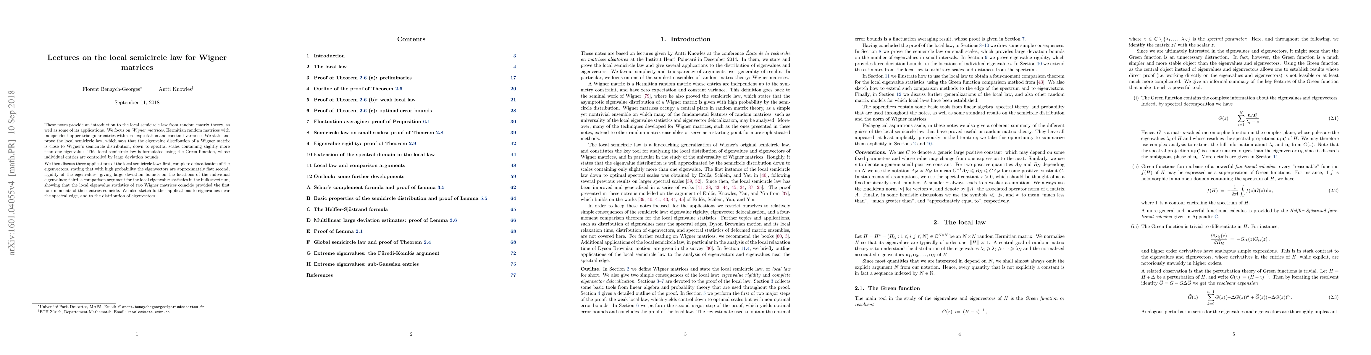 These notes provide an introduction to the local semicircle law from random matrix theory, as well as some of its applications. We focus on Wigner matrices, Hermitian random matrices with independent upper-triangular entries with zero expectation and constant variance. We state and prove the local semicircle law, which says that the eigenvalue distribution of a Wigner matrix is close to Wigner's semicircle distribution, down to spectral scales containing slightly more than one eigenvalue. This local semicircle law is formulated using the Green function, whose individual entries are controlled by large deviation bounds. We then discuss three applications of the local semicircle law: first, complete delocalization of the eigenvectors, stating that with high probability the eigenvectors are approximately flat; second, rigidity of the eigenvalues, giving large deviation bounds on the locations of the individual eigenvalues; third, a comparison argument for the local eigenvalue statistics in the bulk spectrum, showing that the local eigenvalue statistics of two Wigner matrices coincide provided the first four moments of their entries coincide. We also sketch further applications to eigenvalues near the spectral edge, and to the distribution of eigenvectors.