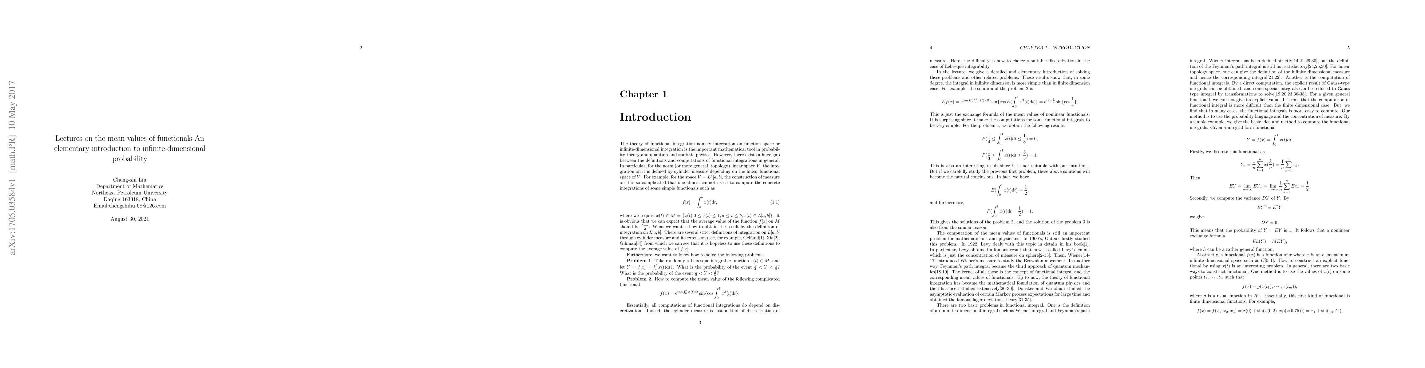 This is an elementary introduction to infinite-dimensional probability. In the lectures, we compute the exact mean values of some functionals on C[0,1] and L[0,1] by considering these functionals as infinite-dimensional random variables. The results show that there exist the complete concentration of measure phenomenon for these mean values since the variances are all zeroes.