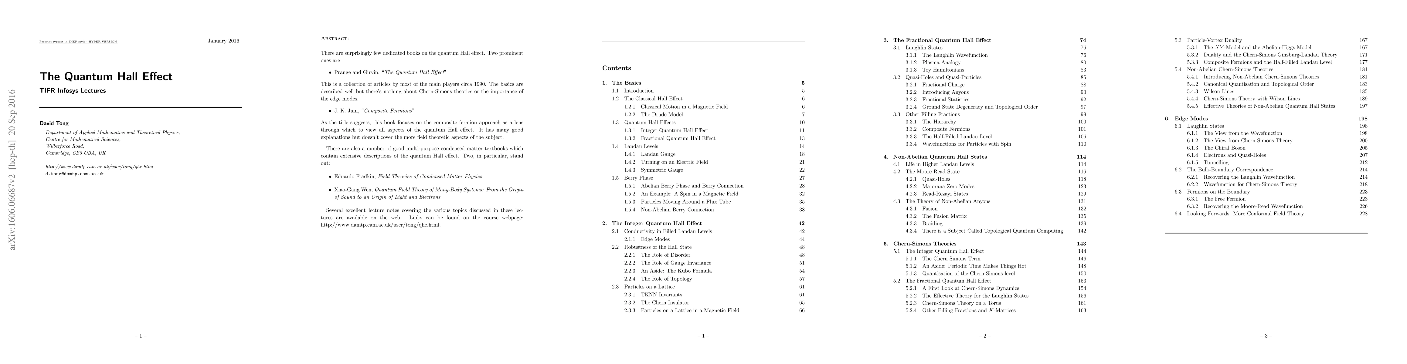 **Summary:** This set of lectures delves into the quantum Hall effect, explaining the foundational theories that reveal its intricate physics. It covers Landau levels, integer and fractional quantum Hall states, and explores Chern-Simons theories and edge modes for boundary modes. Assumes familiarity with quantum field theory.