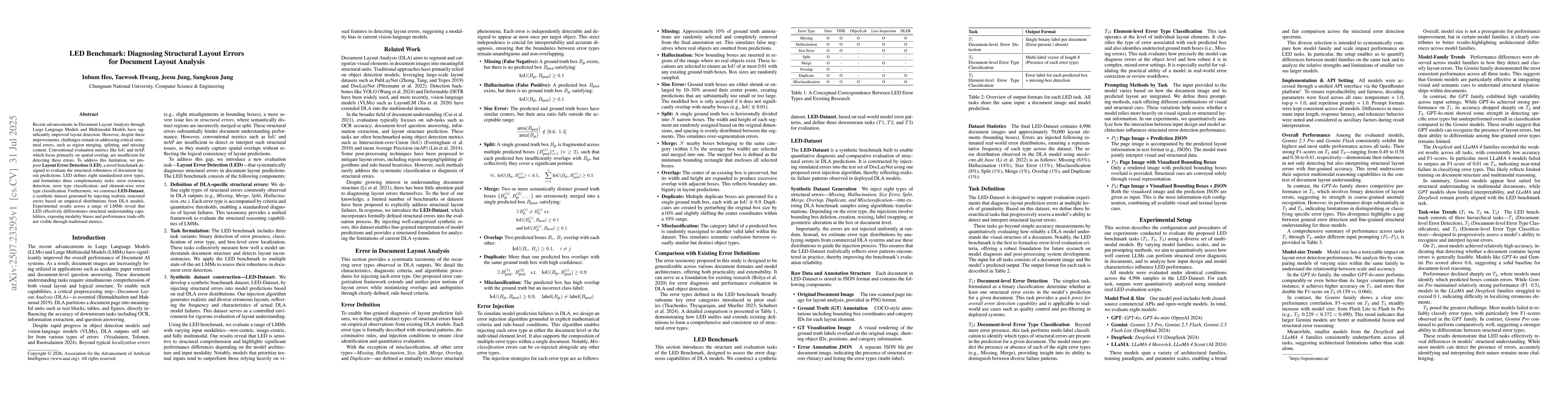 This research is significant as it introduces LED, a benchmark that evaluates structural layout errors in DLA systems, focusing on semantically meaningful failures rather than just spatial overlap. It provides a foundation for understanding model limitations and encourages the development of more robust DLA systems.