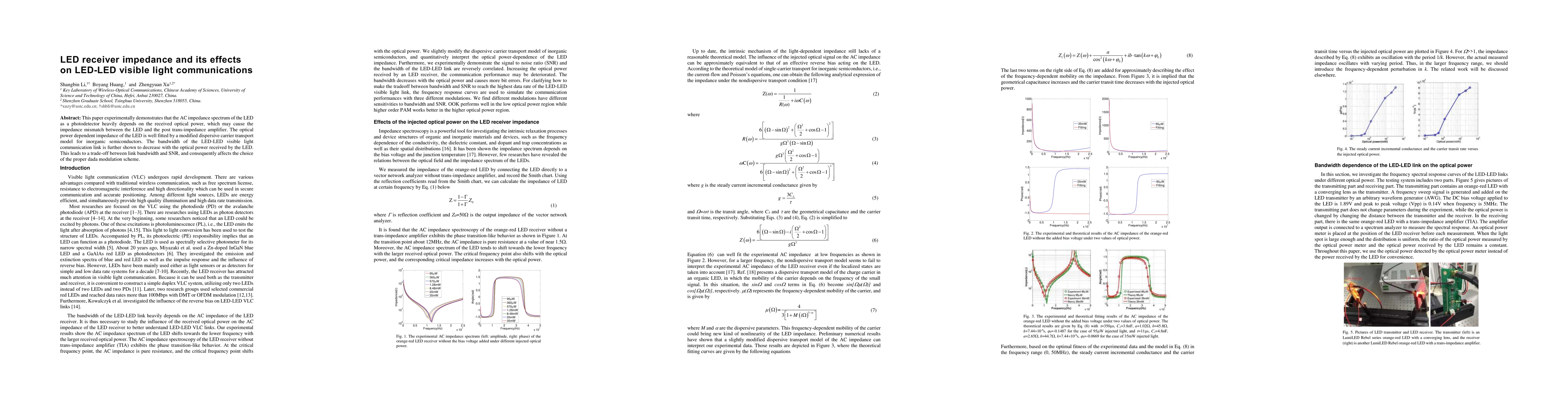 This paper experimentally demonstrates that the AC impedance spectrum of the LED as a photodetector heavily depends on the received optical power, which may cause the impedance mismatch between the LED and the post trans-impedance amplifier. The optical power dependent impedance of the LED is well fitted by a modified dispersive carrier transport model for inorganic semiconductors. The bandwidth of the LED-LED visible light communication link is further shown to decrease with the optical power received by the LED. This leads to a trade-off between link bandwidth and SNR, and consequently affects the choice of the proper dada modulation scheme.