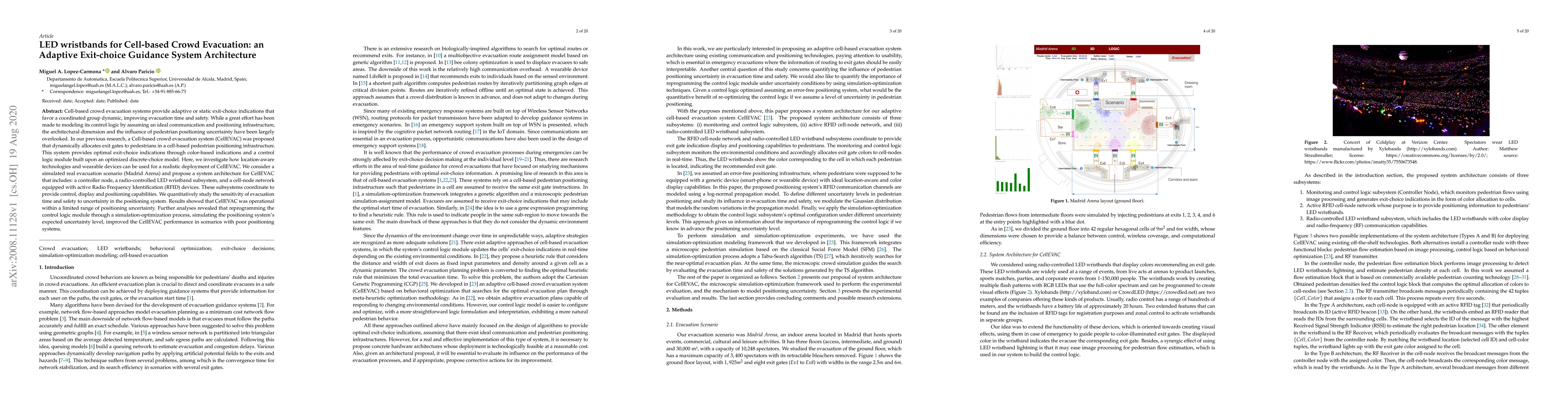 This paper proposes an adaptive exit-choice guidance system architecture for crowd evacuation using LED wristbands and RFID technology. The system, CellEVAC, dynamically allocates optimal exit routes through color-based indications, and its performance is analyzed under varying levels of positioning uncertainty, showing improved evacuation efficiency when control logic is optimized for expected uncertainties.