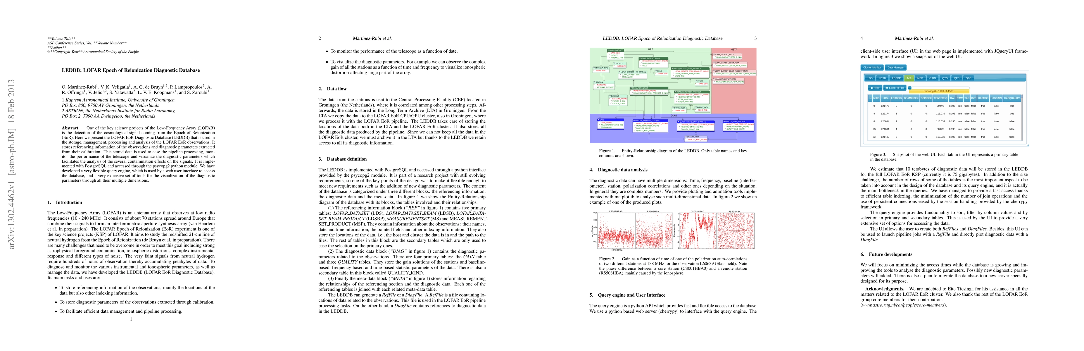 The LOFAR EoR Diagnostic Database (LEDDB) is a comprehensive system for storing, managing, and analyzing LOFAR observations aimed at detecting the cosmological signal from the Epoch of Reionization. It utilizes PostgreSQL for data management and offers a flexible query engine and extensive visualization tools to facilitate the analysis of contamination effects on the signals.