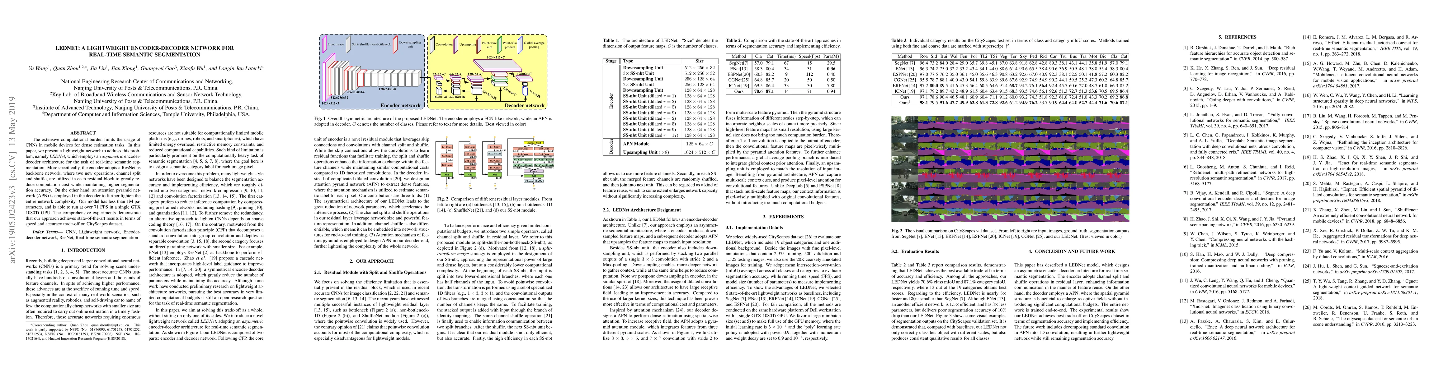 LEDNet is a lightweight network designed for real-time semantic segmentation, utilizing an asymmetric encoder-decoder architecture with a ResNet backbone and innovative channel split and shuffle operations. The attention pyramid network in the decoder further reduces complexity, achieving state-of-the-art speed and accuracy on the CityScapes dataset.