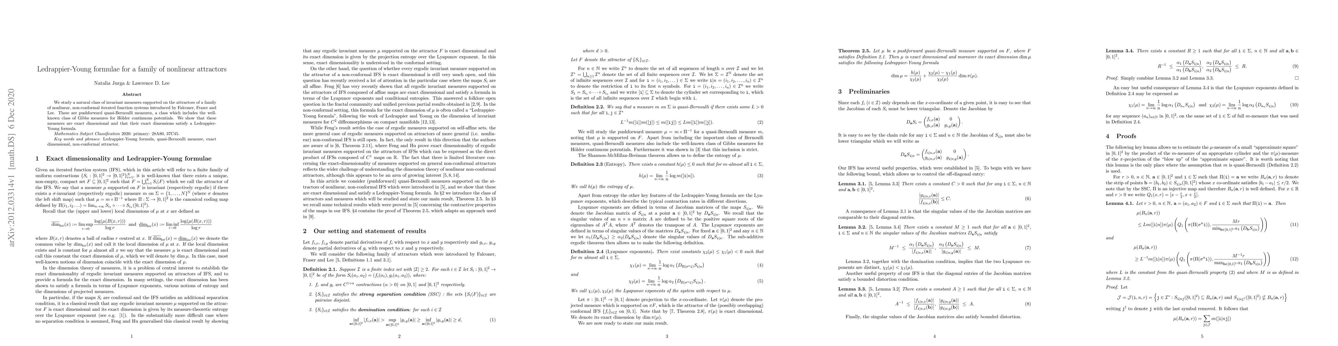 This paper investigates invariant measures on nonlinear attractors from a family of iterated function systems, proving they are exact dimensional and satisfy Ledrappier-Young formulae, extending the concept to quasi-Bernoulli measures.