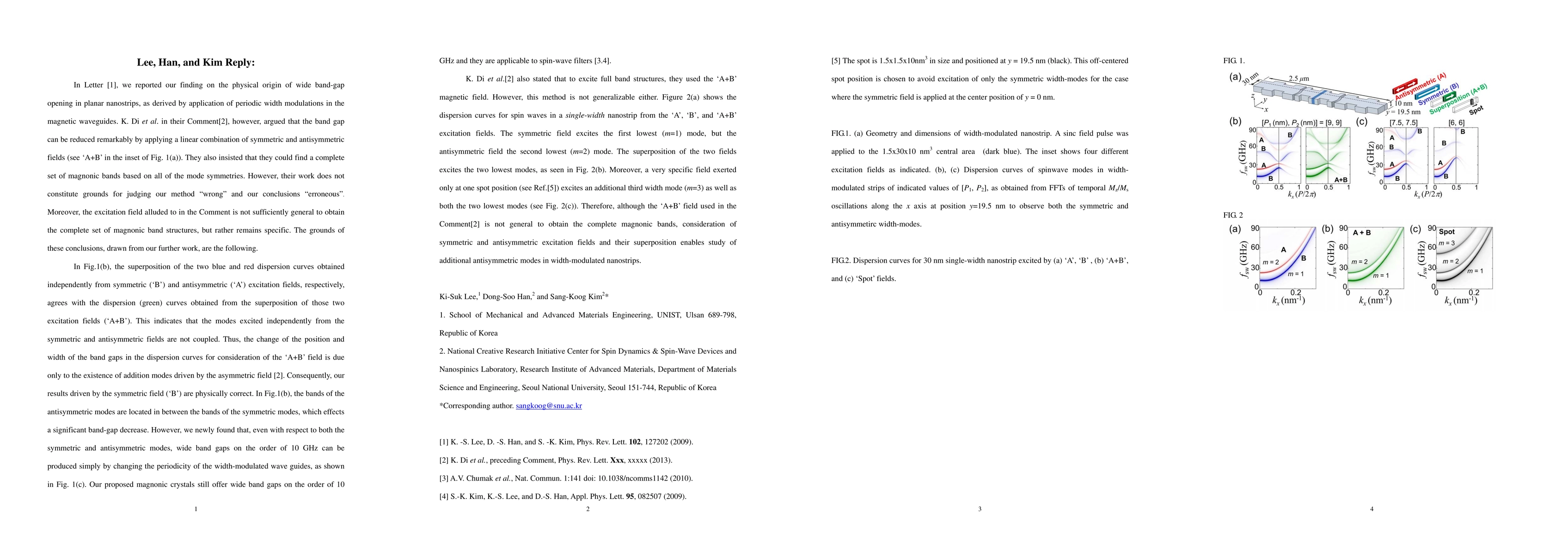 In Letter [1], we reported our finding on the physical origin of wide band-gap opening in planar nanostrips, as derived by application of periodic width modulations in the magnetic waveguides. K. Di et al. in their Comment[2], however, argued that the band gap can be reduced remarkably by applying a linear combination of symmetric and antisymmetric fields (see 'A+B' in the inset of Fig. 1(a)). They also insisted that they could find a complete set of magnonic bands based on all of the mode symmetries. However, their work does not constitute grounds for judging our method "wrong" and our conclusions "erroneous". Moreover, the excitation field alluded to in the Comment is not sufficiently general to obtain the complete set of magnonic band structures, but rather remains specific. The grounds of these conclusions, drawn from our further work, are the following.