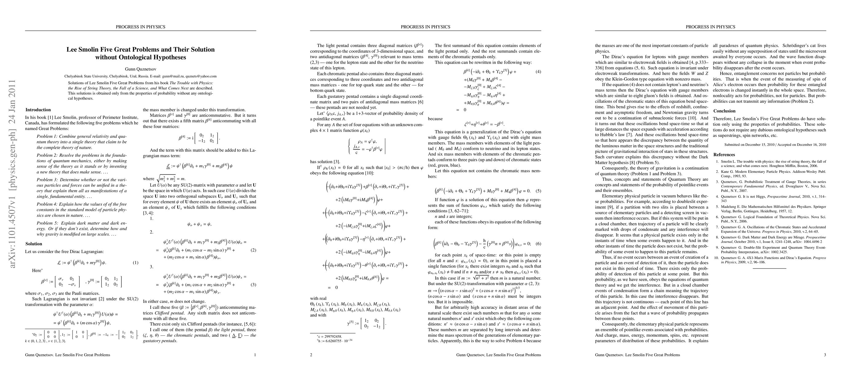 Solutions of Lee Smolin Five Great Problems from his book {\it The Trouble with Physics: the Rise of String Theory, the Fall of a Science, and What Comes Next} are described. This solutions is obtained only from the properties of probability without any ontological hypotheses.
