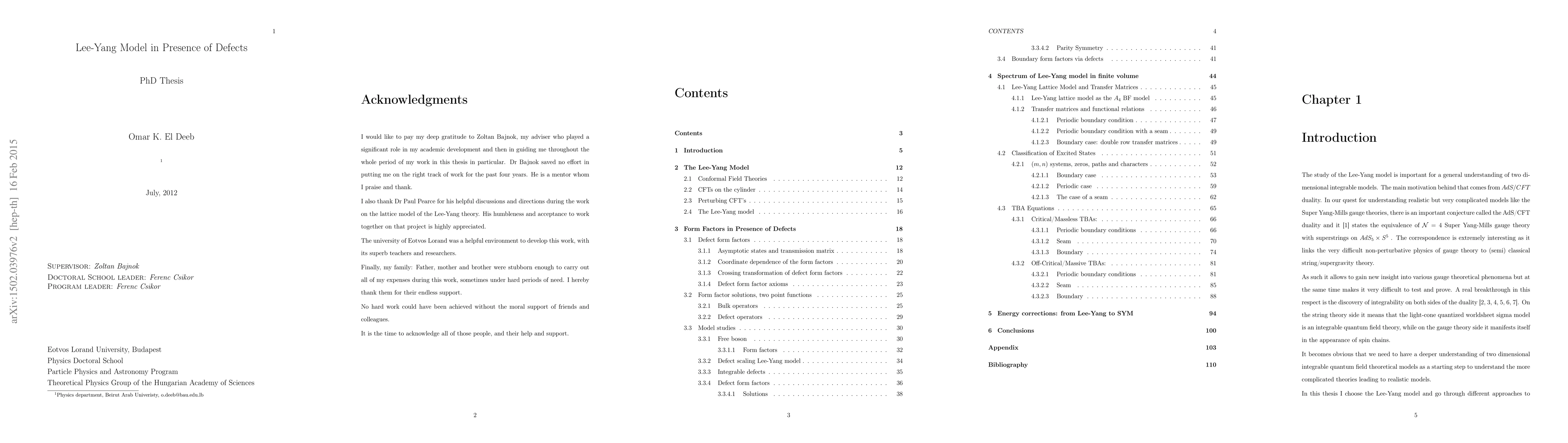 I choose the Lee-Yang model and go through different approaches to analyze it using the form factor approach and the bootstrap program, the lattice description and the lattice TBA equations for a full understanding of the model. The bootstrap program aims to explicitly solve 1+1 dimensional integrable quantum field theories. In the first step, called the S-matrix bootstrap, the scattering matrix, is determined from its properties. In developing a defect form factor program the first step is the T-matrix bootstrap. Interacting integrable defect theories are purely transmitting and topological. We analyze both operators localized in the bulk and also on the defect. By finding their solutions, the spectral representation of any correlator can be determined. Next we consider the model on the lattice. The lattice approach allows to obtain both massive and massless excited TBA equations by studying the continuum scaling limit of the associated integrable lattice models. The most important input from the lattice approach is an insight into the analytic structure of the excited state solutions of the TBA equations. Previously this structure had to be guessed. In this thesis we turn our attention to the simplest example of a non-unitary minimal theory, namely, the Lee-Yang minimal model M(2,5). We study the Lee-Yang model on the lattice. We analyze the periodic, boundary and the seam cases in both massive and massless regimes. We derive their ground state TBA equations and analyze the flows between different boundary and defect conditions. Finally, in the large volume limit, we calculate the L\"uscher correction terms of the TBA energy of a one-particle state. We display those ideas in the end of the thesis as this is an important direction of work in string theory, particularly in the AdS/CFT correspondence.