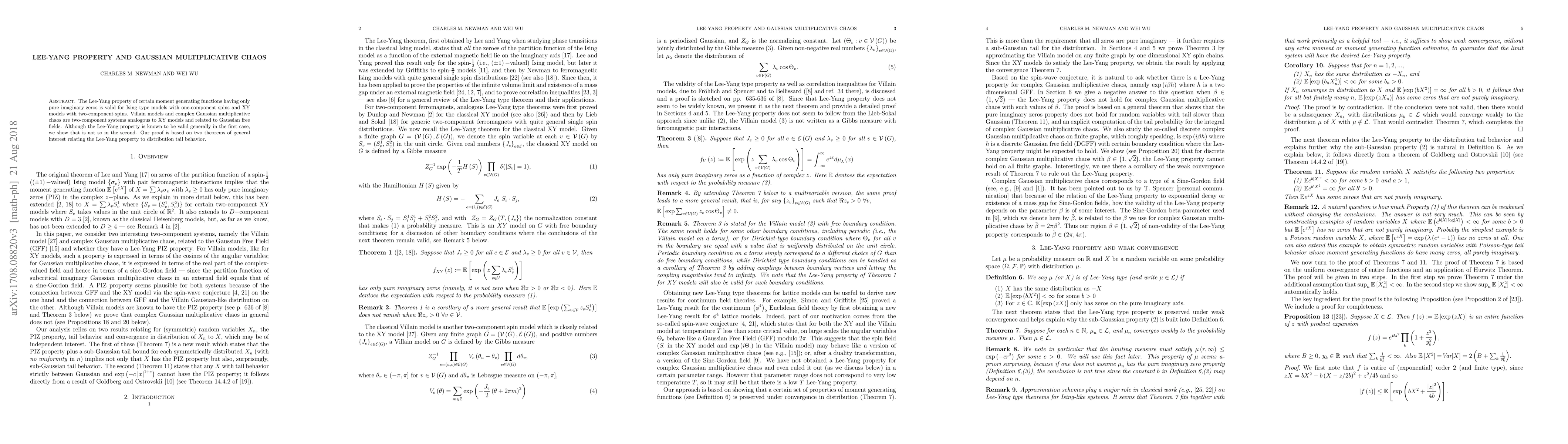 The Lee-Yang property holds for certain statistical models with one-component spins, but not for two-component systems like XY models and Gaussian multiplicative chaos, highlighting a difference in distribution tail behavior.