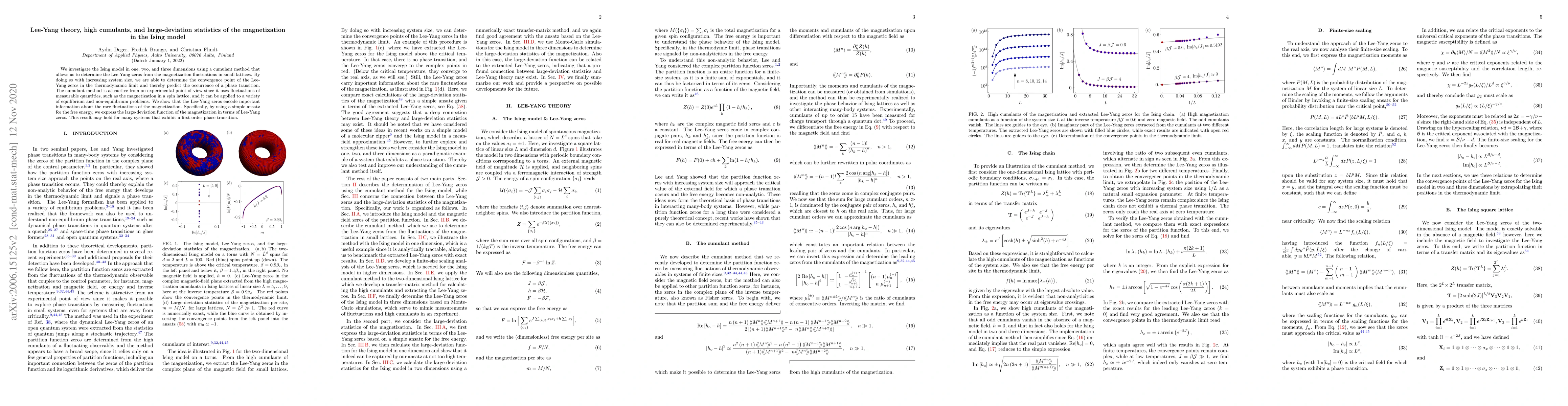 This paper uses a cumulant method to determine Lee-Yang zeros from magnetization fluctuations in the Ising model across dimensions, revealing their convergence in the thermodynamic limit and predicting phase transitions. It shows that Lee-Yang zeros encode information about rare magnetization fluctuations and relates them to the large-deviation function of magnetization.