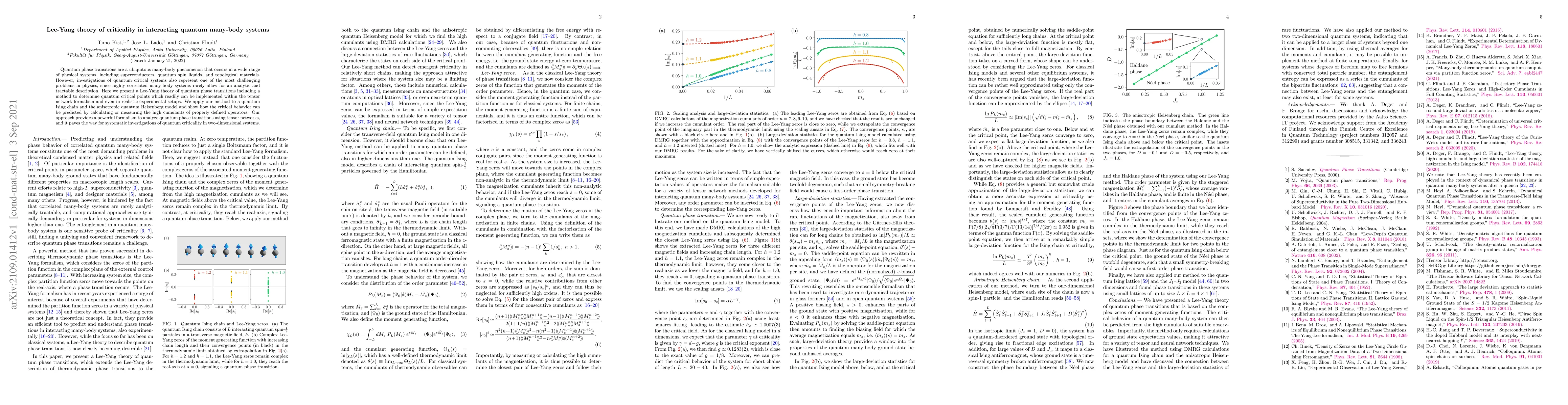 This paper presents a Lee-Yang theory for quantum phase transitions in interacting quantum many-body systems, offering a method to determine quantum critical points within the tensor network formalism. The approach is demonstrated on quantum Ising and Heisenberg models, showing how critical behavior can be predicted via high cumulants of defined operators.