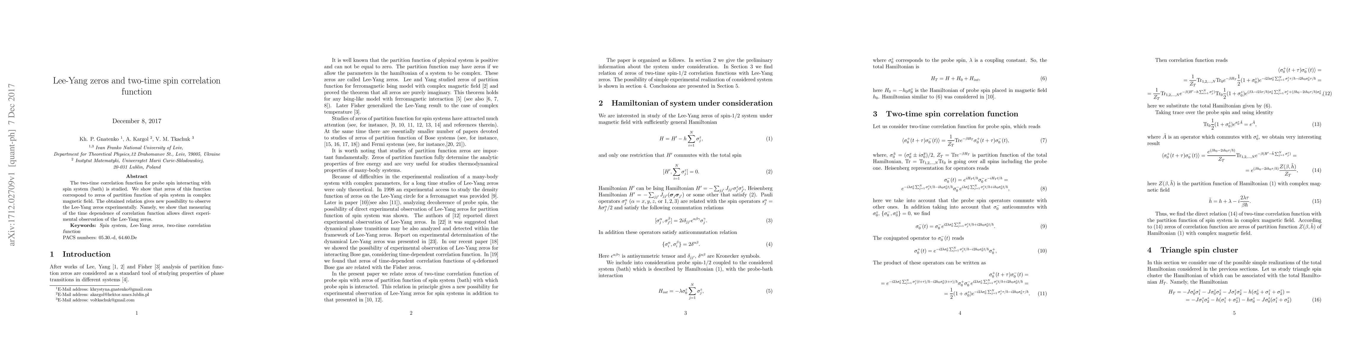 This study explores the two-time correlation function for a probe spin interacting with a spin system, revealing that its zeros correspond to those of the spin system's partition function under complex magnetic fields. This finding offers a new experimental method to observe Lee-Yang zeros by measuring the time dependence of the correlation function.