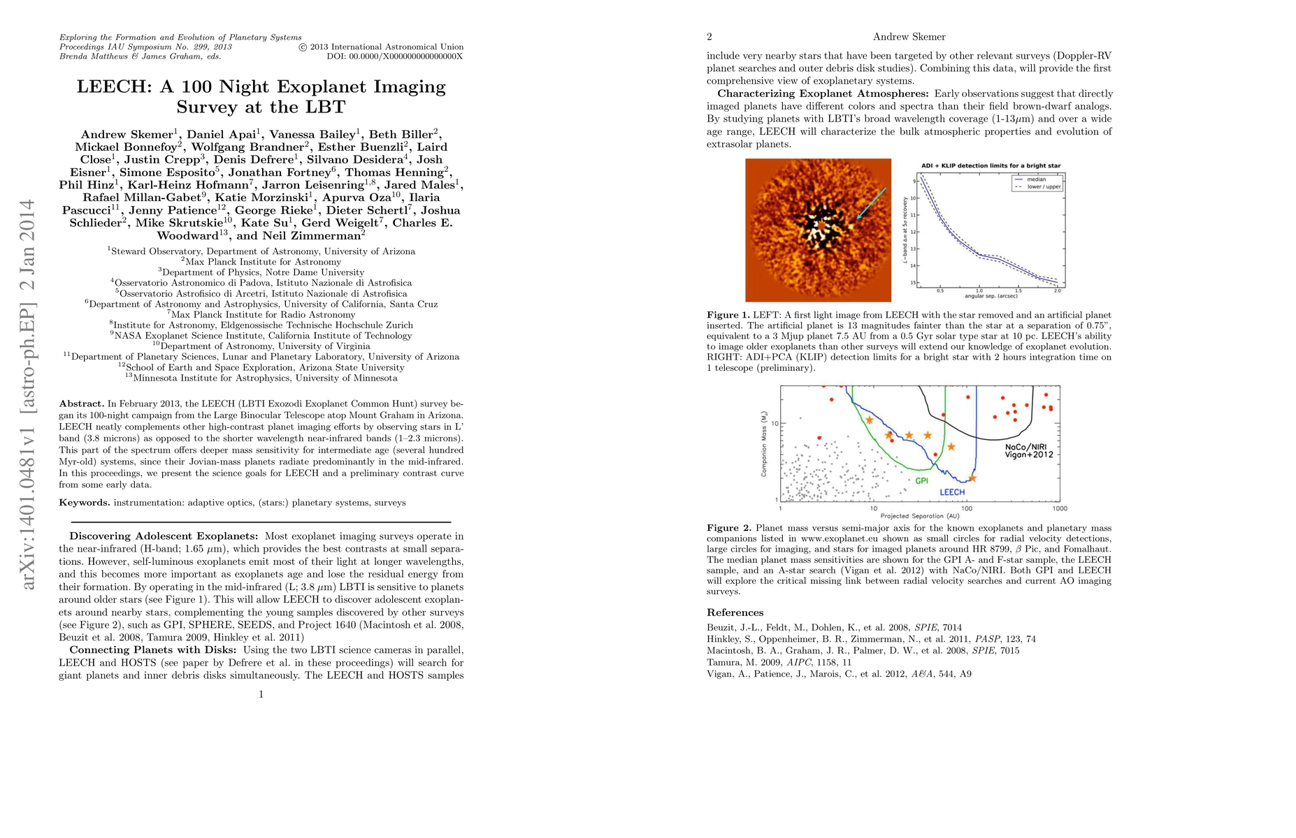 The LEECH survey observed 100 nights at the Large Binocular Telescope to detect exoplanets in L' band, a longer wavelength that allows for deeper mass sensitivity for older systems.