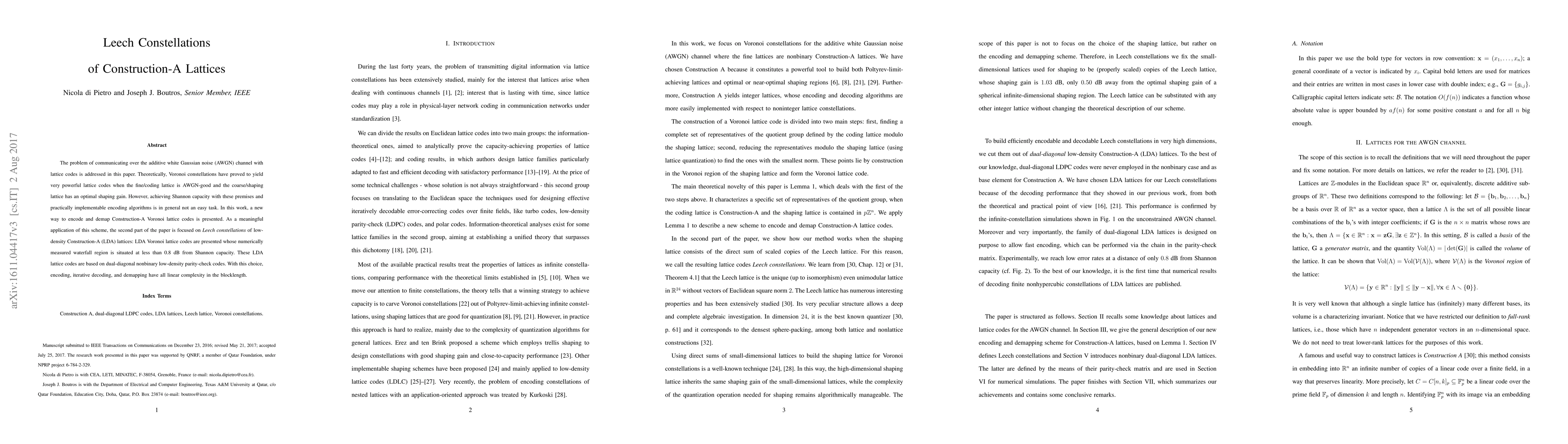 The paper presents a novel encoding and demapping scheme for Construction-A lattices, utilizing dual-diagonal low-density parity-check (LDPC) codes and a specific construction of the shaping lattice based on the Leech lattice.
