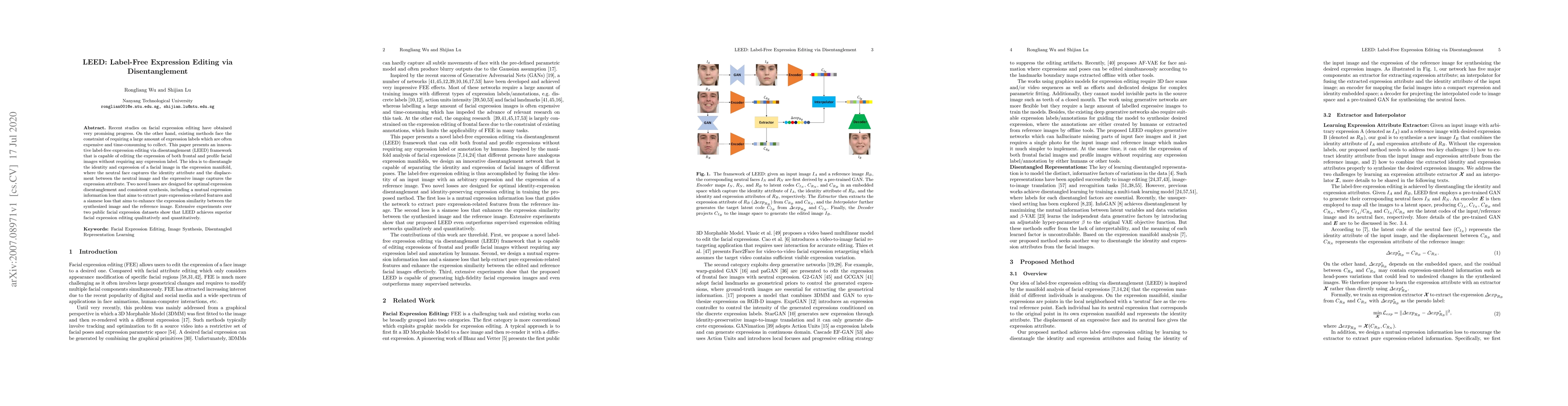 A new label-free facial expression editing framework called LEED achieves superior results without requiring explicit expression labels, using disentanglement techniques to separate identity and expression attributes.