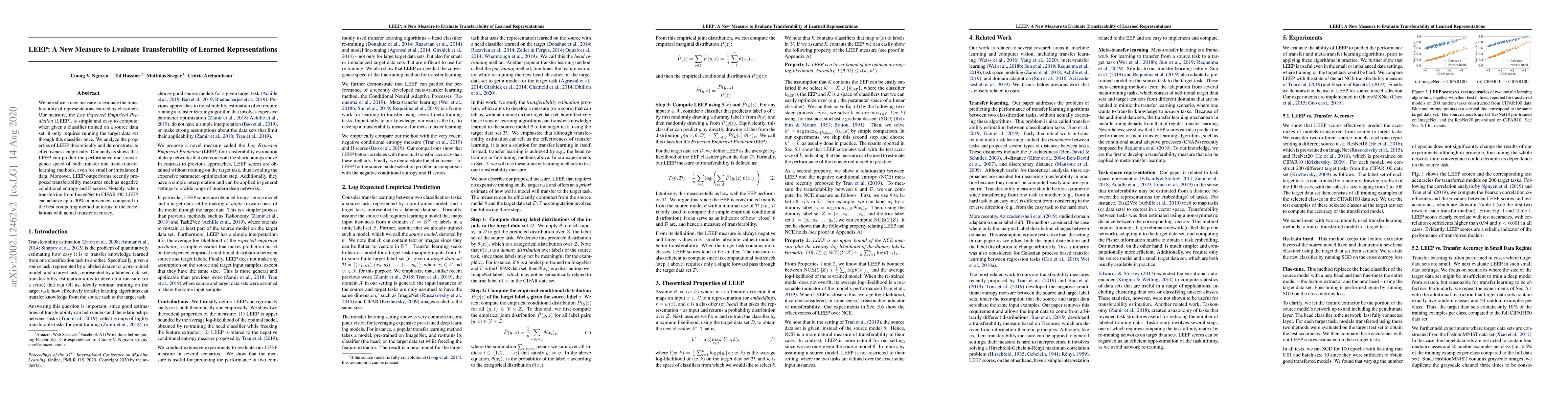 The paper introduces LEEP, a new measure to evaluate the transferability of learned representations, which requires only a single pass of the target data set through a source classifier. LEEP outperforms existing measures and correlates well with the performance and convergence speed of transfer and meta-transfer learning, especially in small or imbalanced data scenarios.