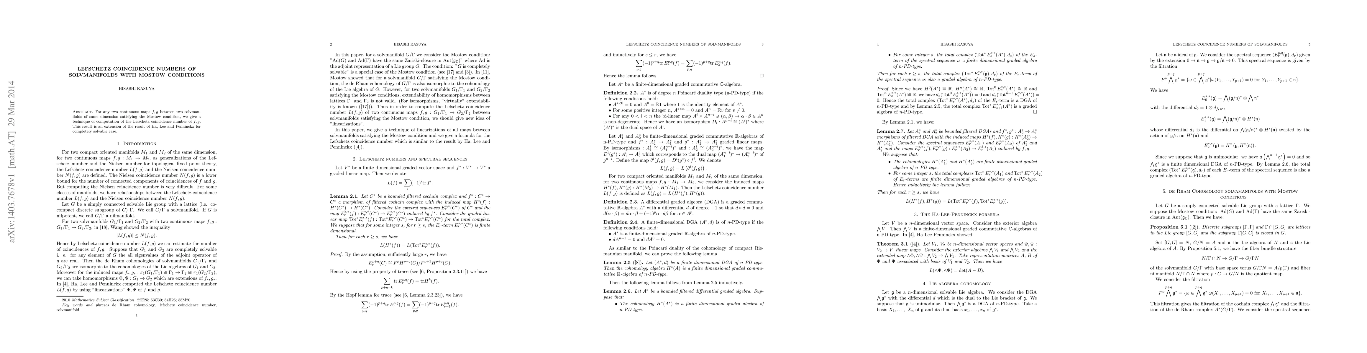 For any two continuous maps $f,g$ between two solvmanifolds of same dimension satisfying the Mostow condition, we give a technique of computation of the Lefschetz coincidence number of $f,g$. This result is an extension of the result of Ha, Lee and Penninckx for completely solvable case.