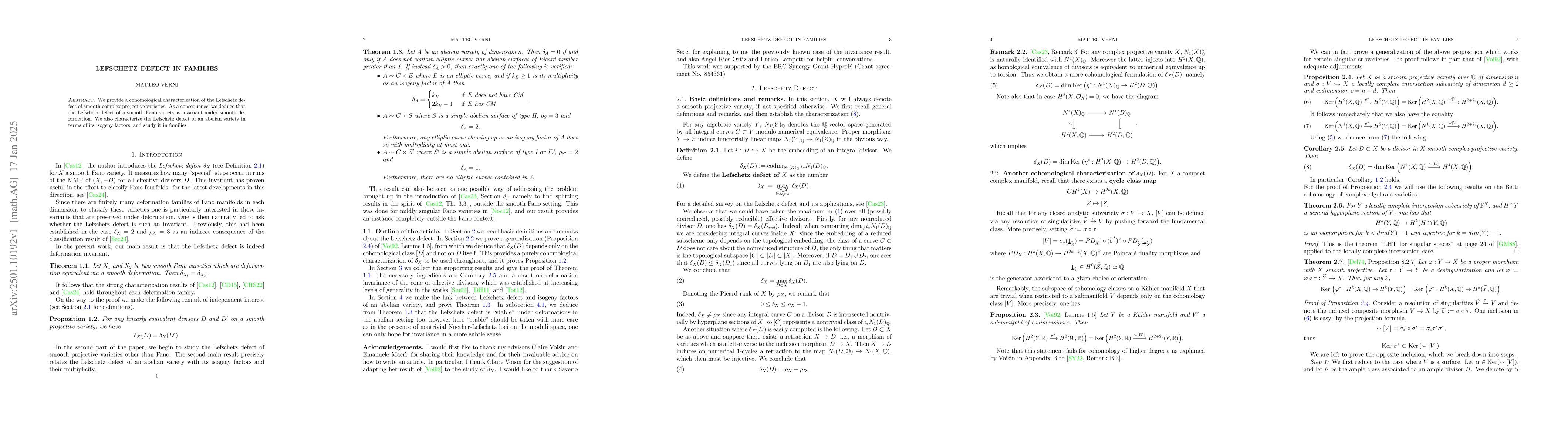 Summary: This paper characterizes the Lefschetz defect of smooth complex projective varieties through cohomological methods and proves its invariance under smooth deformation for Fano varieties. It also relates the Lefschetz defect in abelian varieties to their isogeny factors and explores it within families.