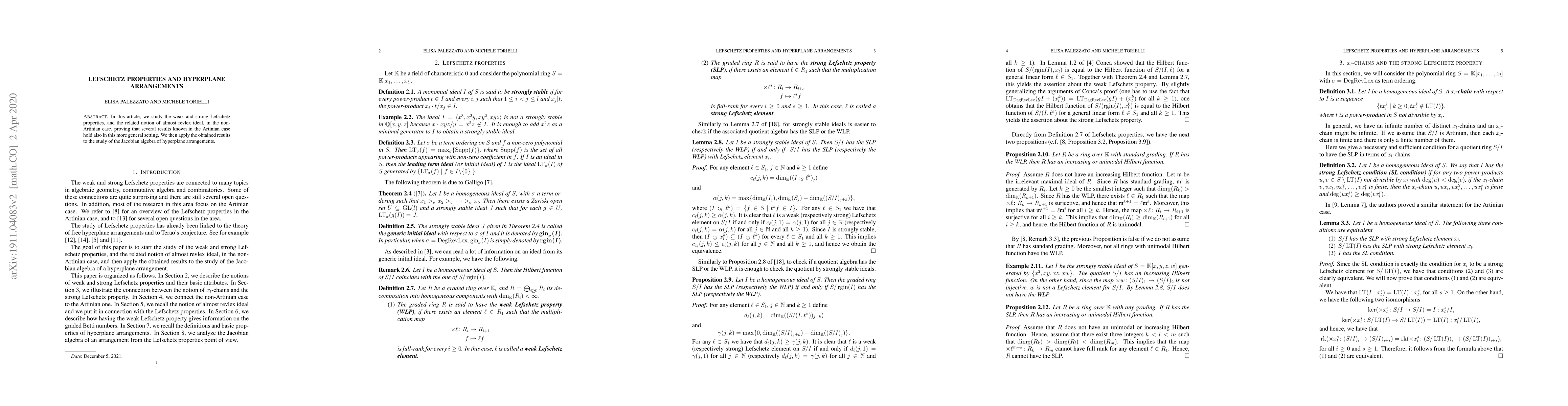In this article, we study the weak and strong Lefschetz properties, and the related notion of almost revlex ideal, in the non-Artinian case, proving that several results known in the Artinian case hold also in this more general setting. We then apply the obtained results to the study of the Jacobian algebra of hyperplane arrangements.