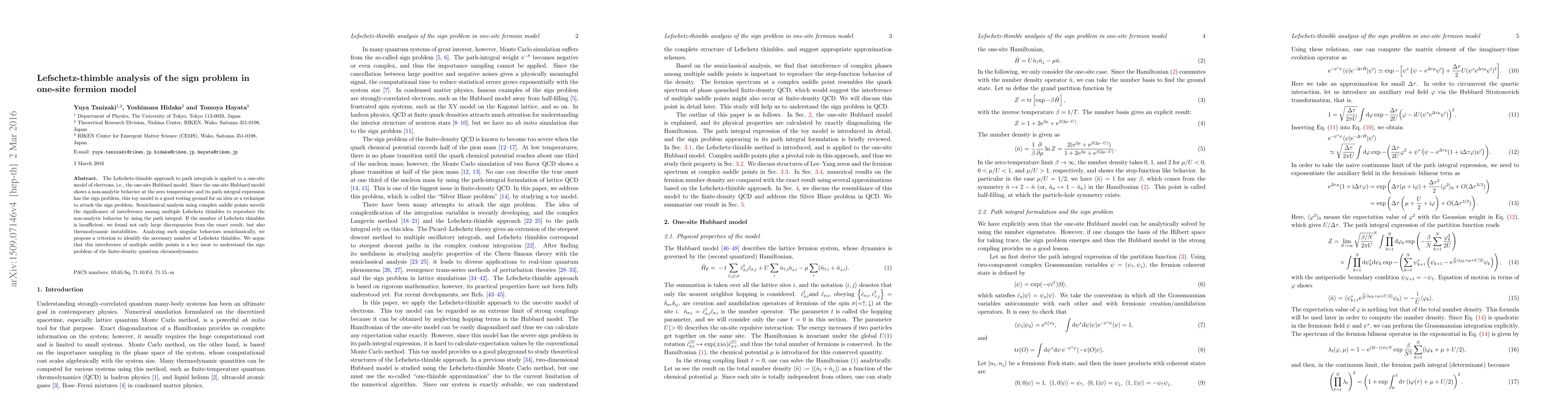 This paper applies the Lefschetz-thimble method to the one-site Hubbard model to address its sign problem, revealing that interference among multiple thimbles is crucial for reproducing non-analytic behavior. The study proposes a criterion for determining the necessary number of thimbles to avoid discrepancies and thermodynamic instabilities, suggesting a broader relevance for understanding sign problems in quantum chromodynamics.