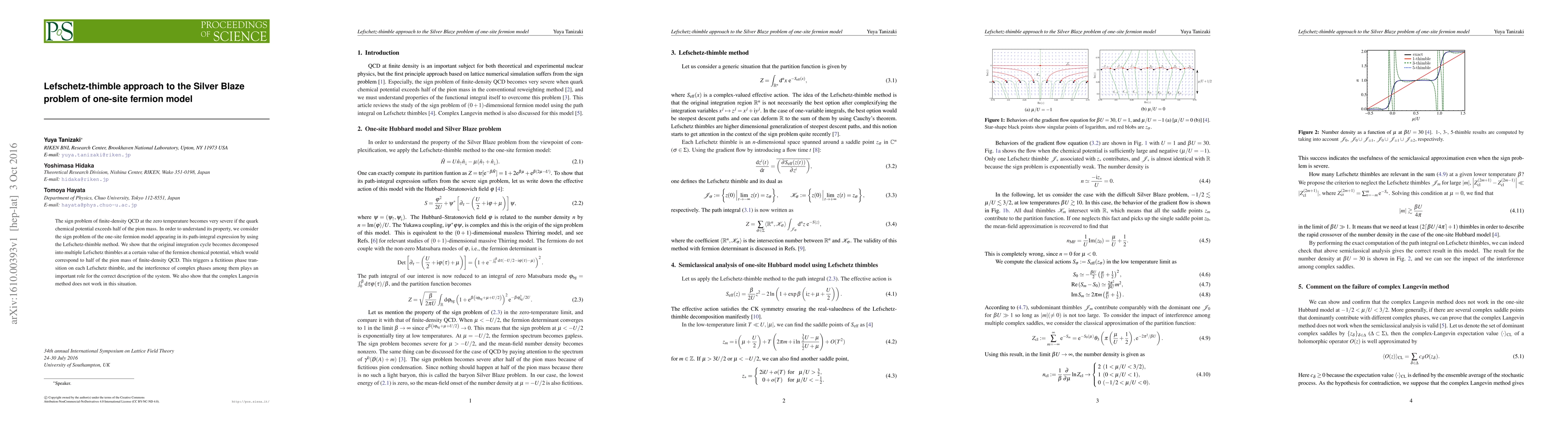 The paper explores the sign problem in the one-site fermion model using the Lefschetz-thimble method, revealing a decomposition of the integration cycle into multiple thimbles at a critical fermion chemical potential, leading to a fictitious phase transition and complex phase interference. The complex Langevin method is found ineffective for this problem.