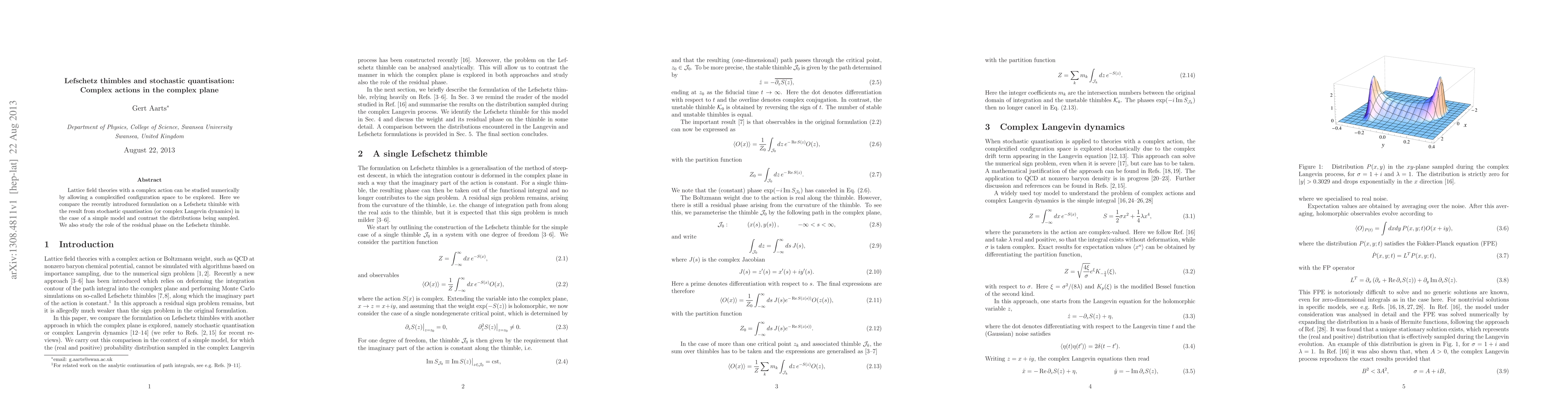 Lattice field theories with a complex action can be studied numerically by allowing a complexified configuration space to be explored. Here we compare the recently introduced formulation on a Lefschetz thimble with the result from stochastic quantisation (or complex Langevin dynamics) in the case of a simple model and contrast the distributions being sampled. We also study the role of the residual phase on the Lefschetz thimble.