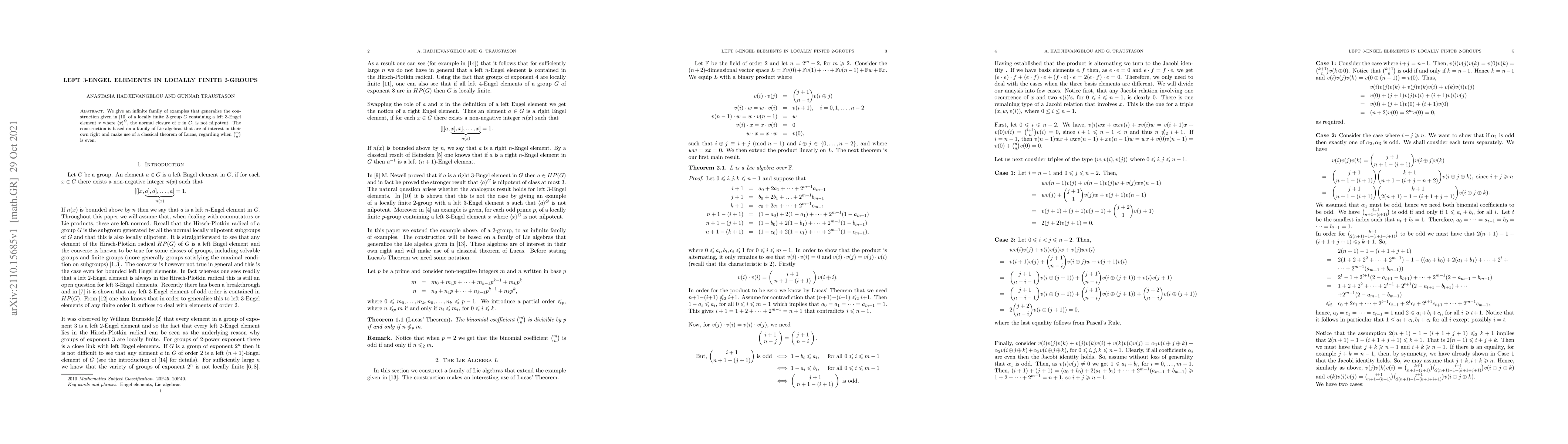 We give an infinite family of examples that generalise the construction given in arXiv:1811.12074 of a locally finite 2-group $G$ containing a left 3-Engel element $x$ where ${\langle x \rangle}^G$, the normal closure of $x$ in $G$, is not nilpotent. The construction is based on a family of Lie algebras that are of interest in their own right and make use of a classical theorem of Lucas, regarding when $\binom{m}{n}$ is even.