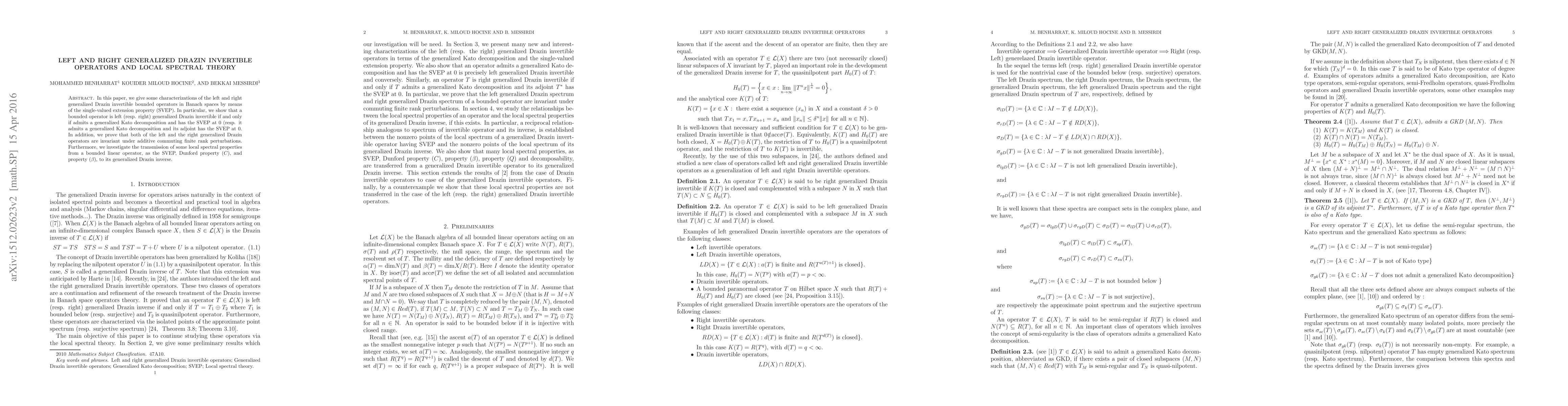 The paper characterizes left and right generalized Drazin invertible operators in Banach spaces using the single-valued extension property (SVEP) and generalized Kato decomposition.