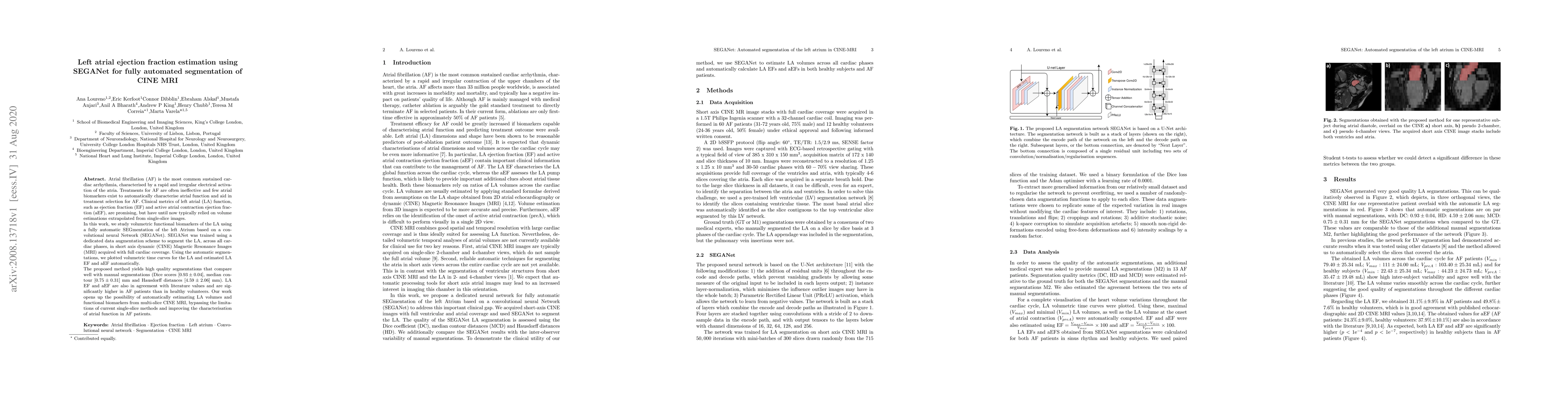 This paper proposes SEGANet, a convolutional neural network for fully automated segmentation of the left atrium in CINE MRI, to estimate left atrial ejection fraction and active atrial contraction ejection fraction. The method shows high accuracy in segmentation and agreement with literature values, potentially improving atrial function characterization in atrial fibrillation patients.
